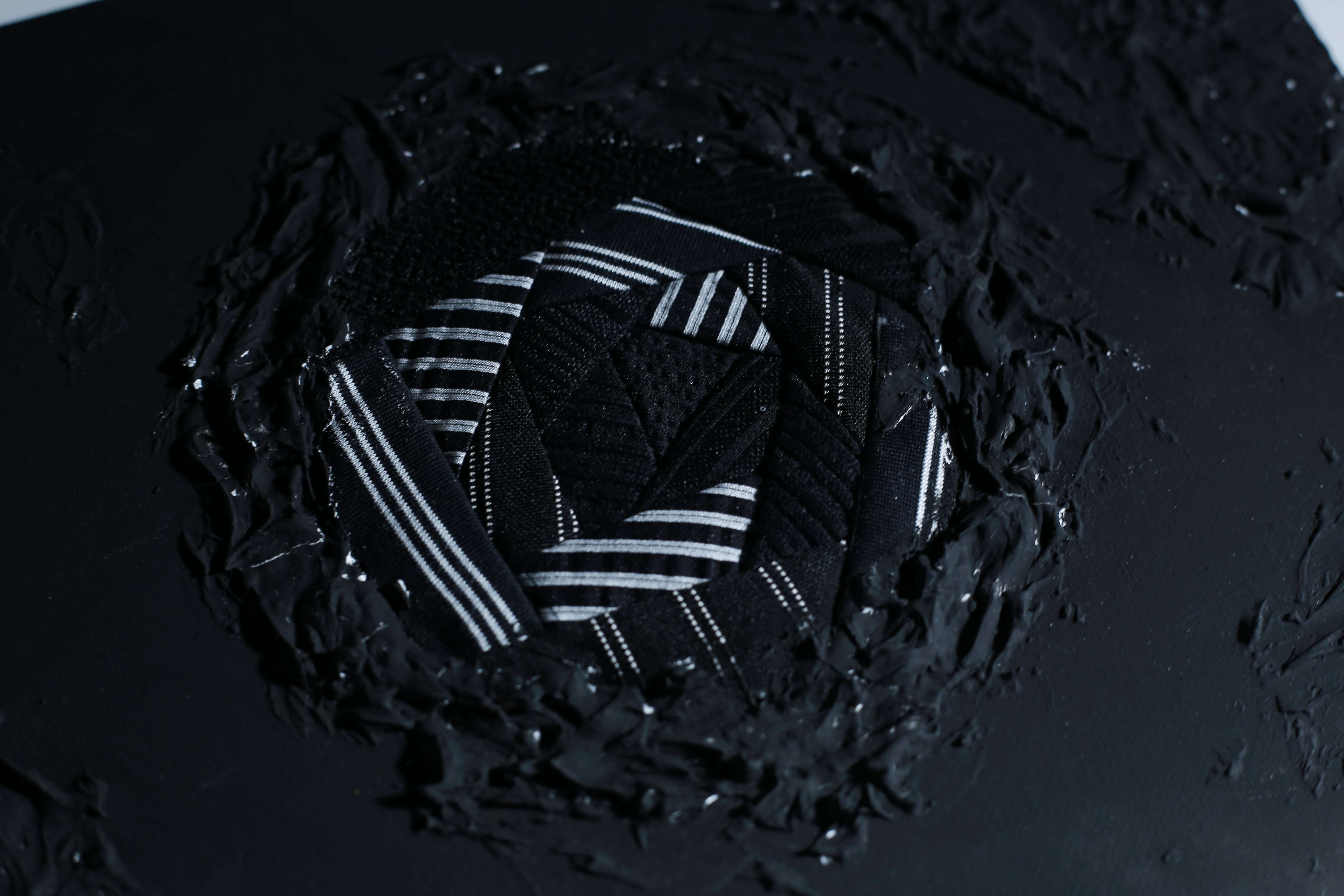 中心には、ブランドが大切にしてきた布を丁寧に組み合わせ、幾何学的なパターンを立体的に配置しました。