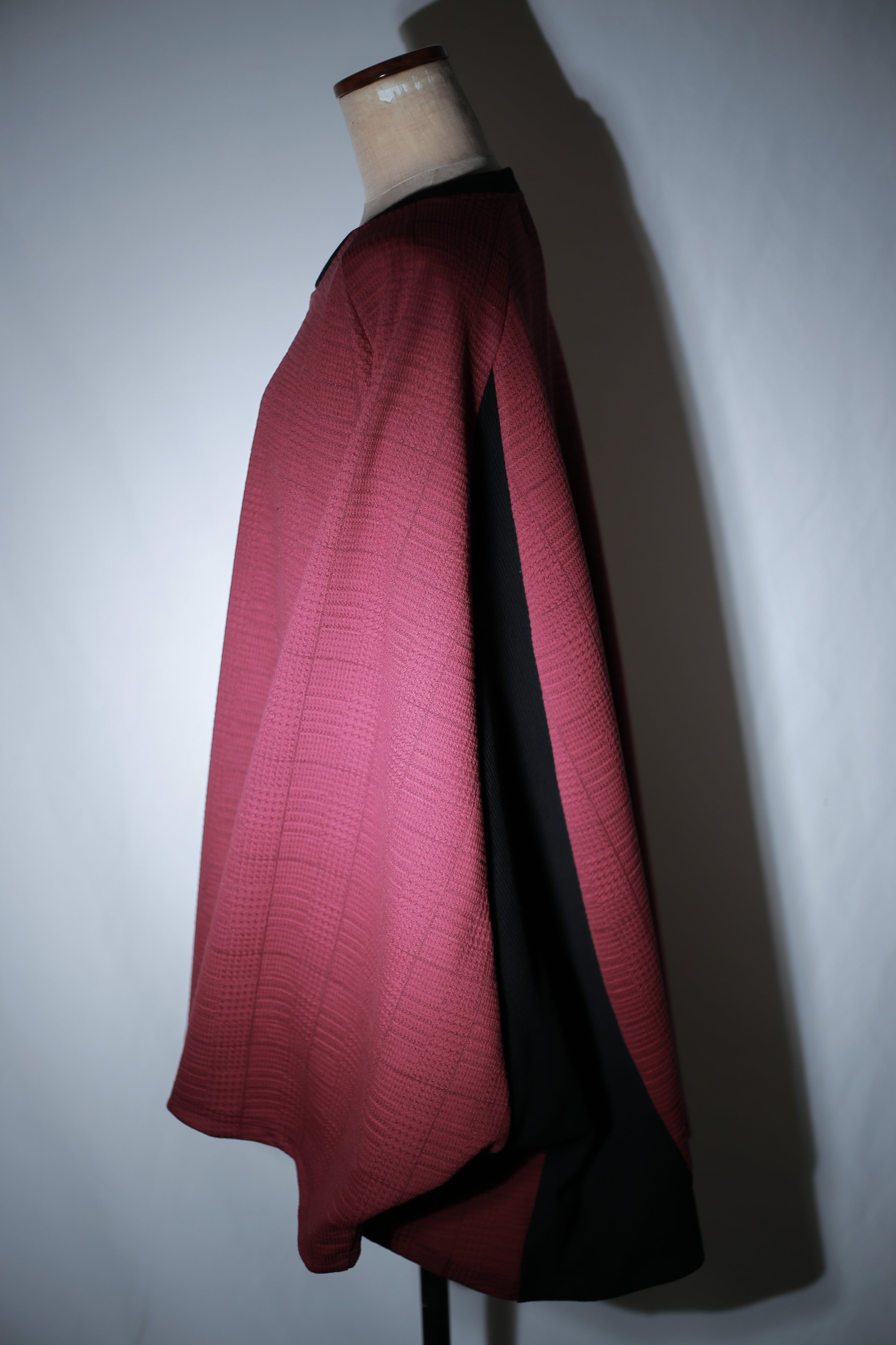 コウモリのような袖と脇のふくらみが、身体に寄り添いながら、空間を包みこむようなボリューム感を演出。
