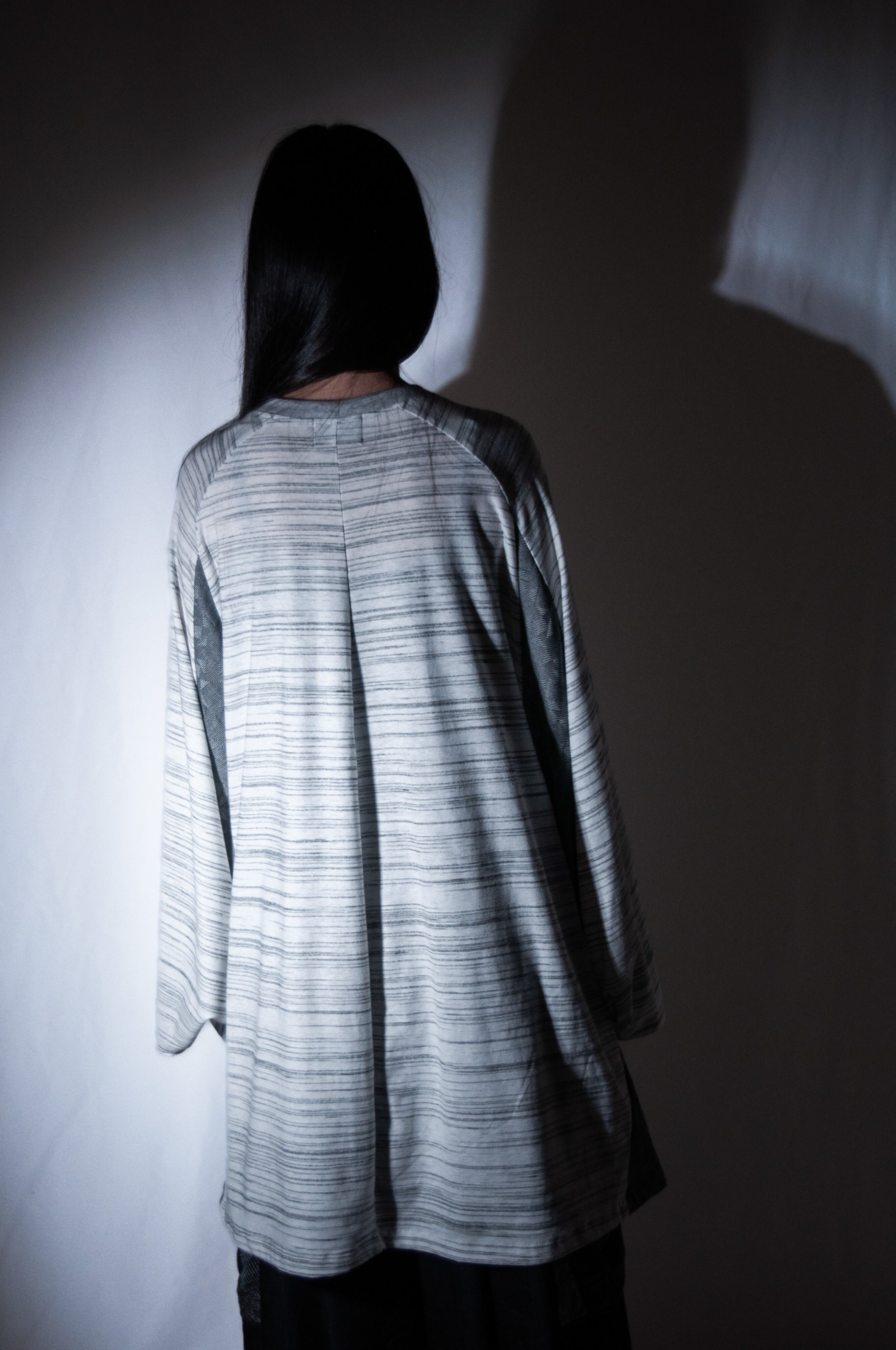 和服を思わせる直線の切り替えと袖の構成に、袖下のゆるやかな曲線が交差し、静かな立体感を生み出します。
