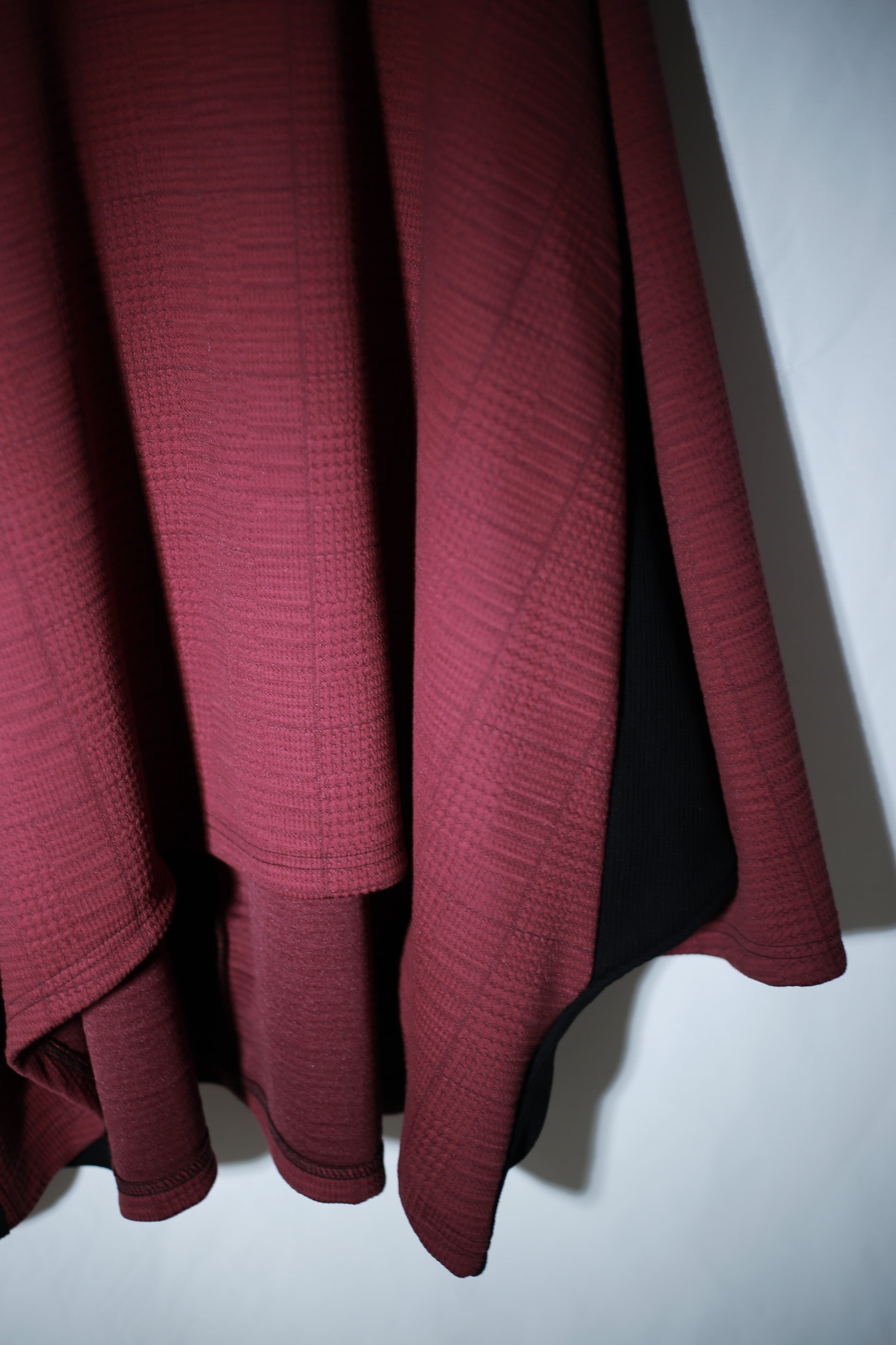 コウモリのような袖と脇のふくらみが、身体に寄り添いながら、空間を包みこむようなボリューム感を演出。