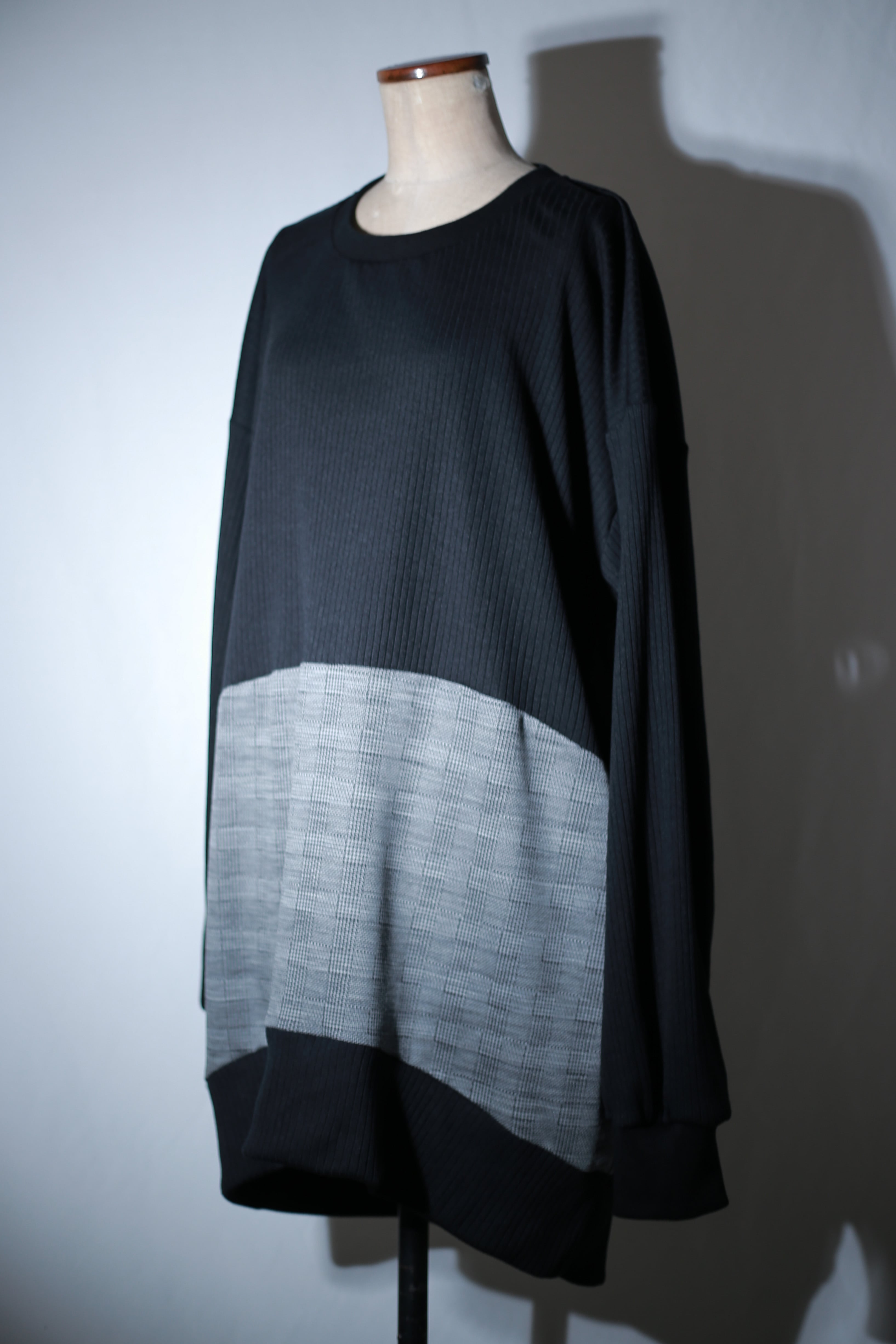 メインにやや薄手のプリーツのような生地感の生地と、幾何学のニットを組み合わせています。