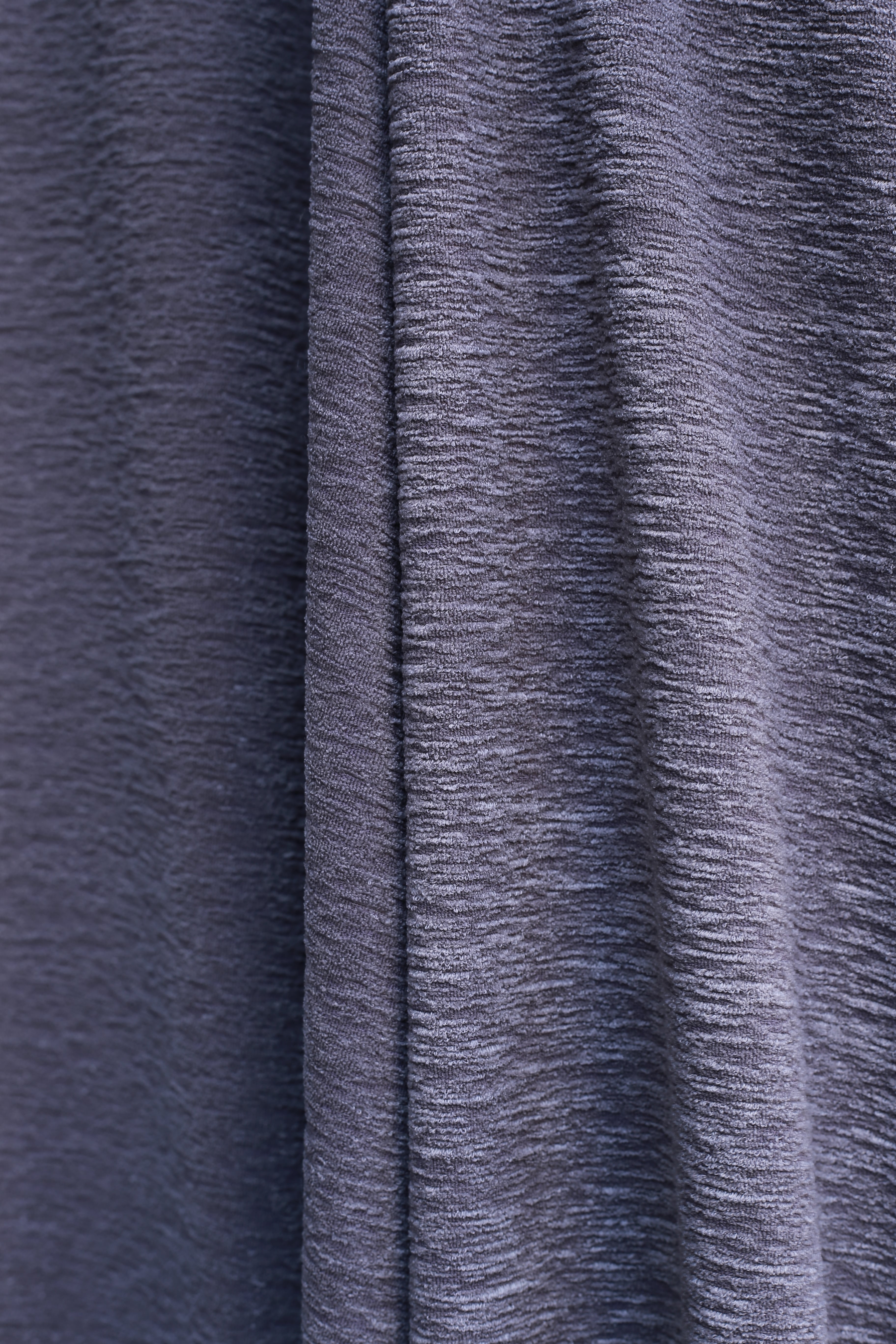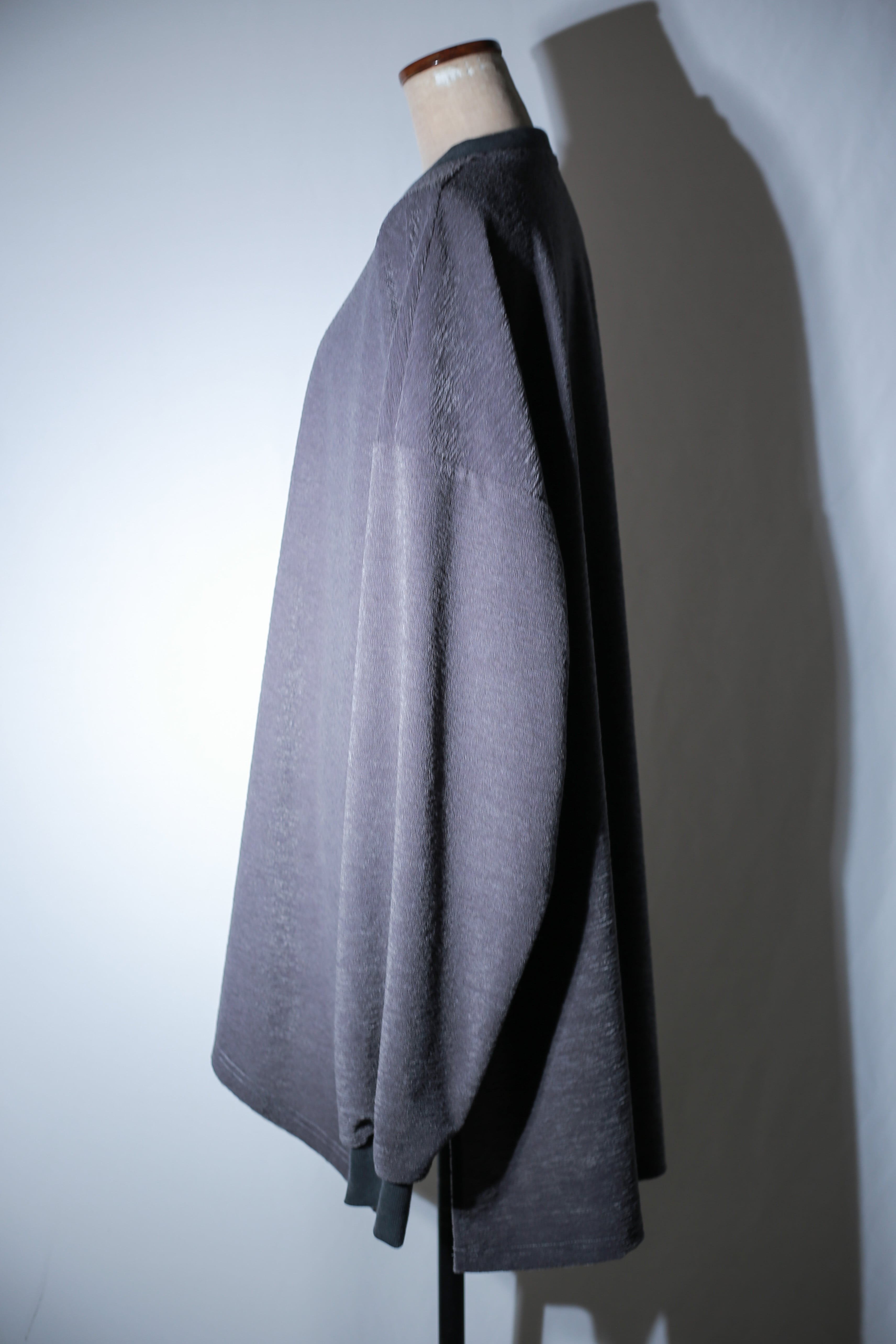 やや薄手の光沢感のあるジャガードニットを使用しています。色味は奥行きのあるグレーで、紫のような色味にも見えます。