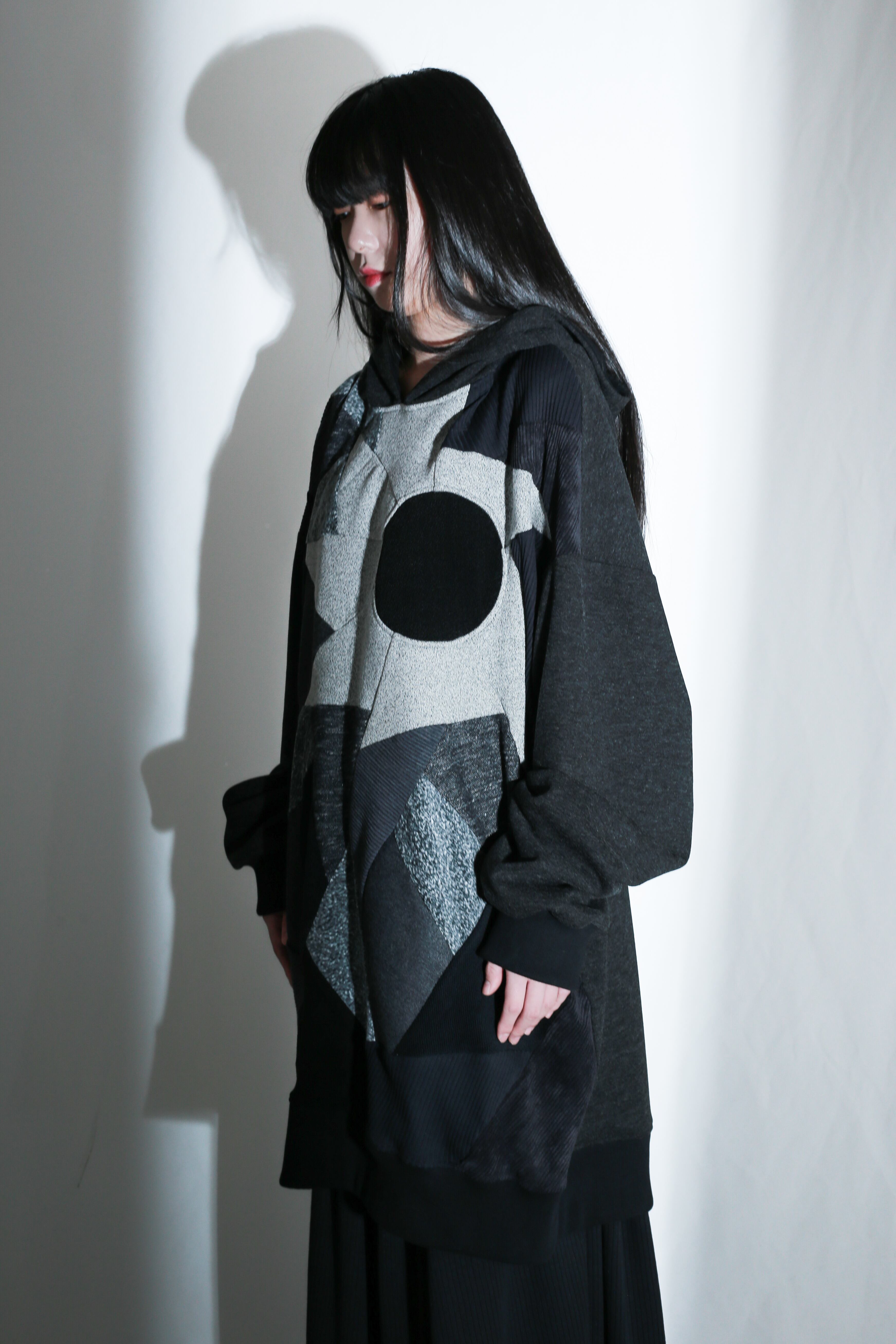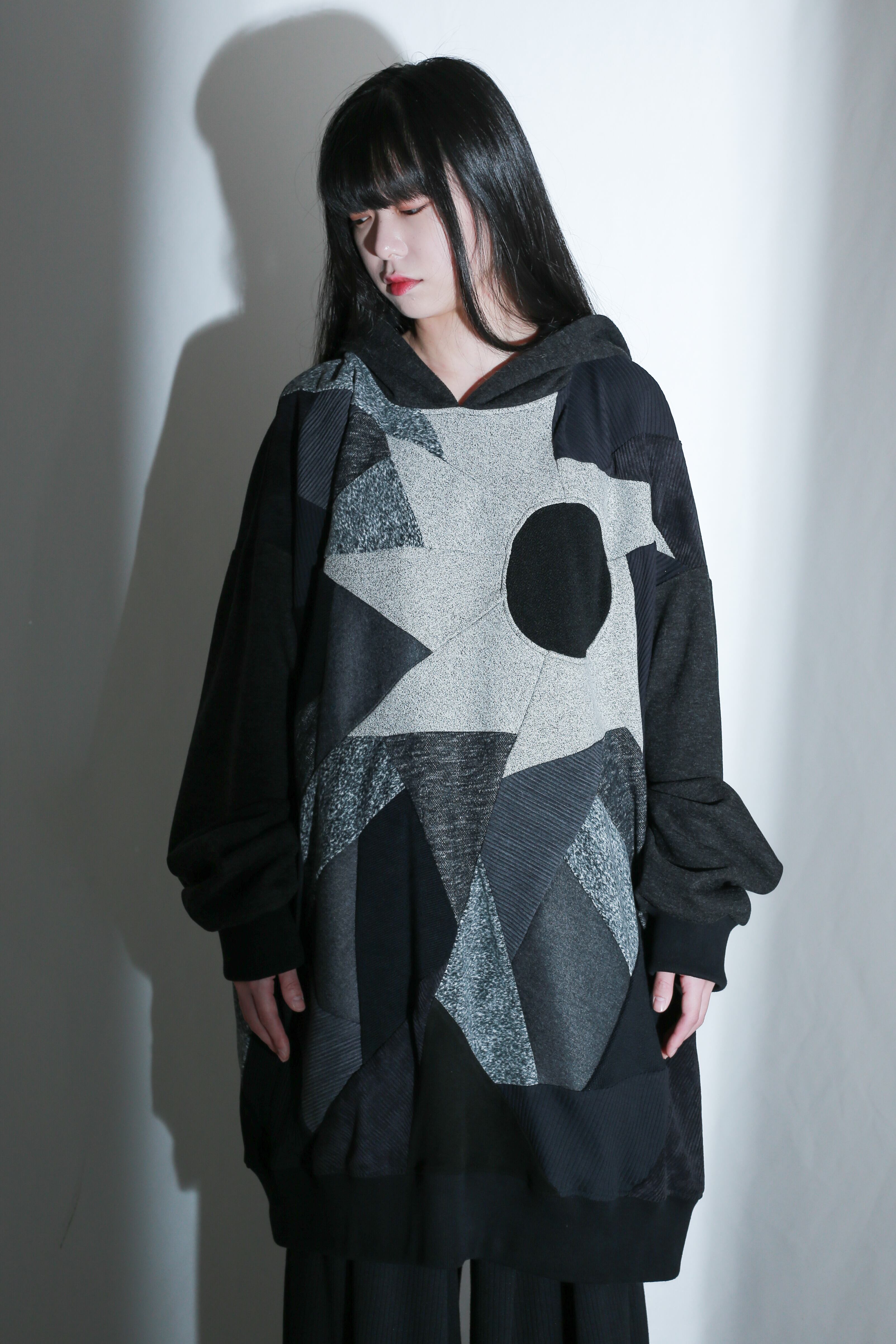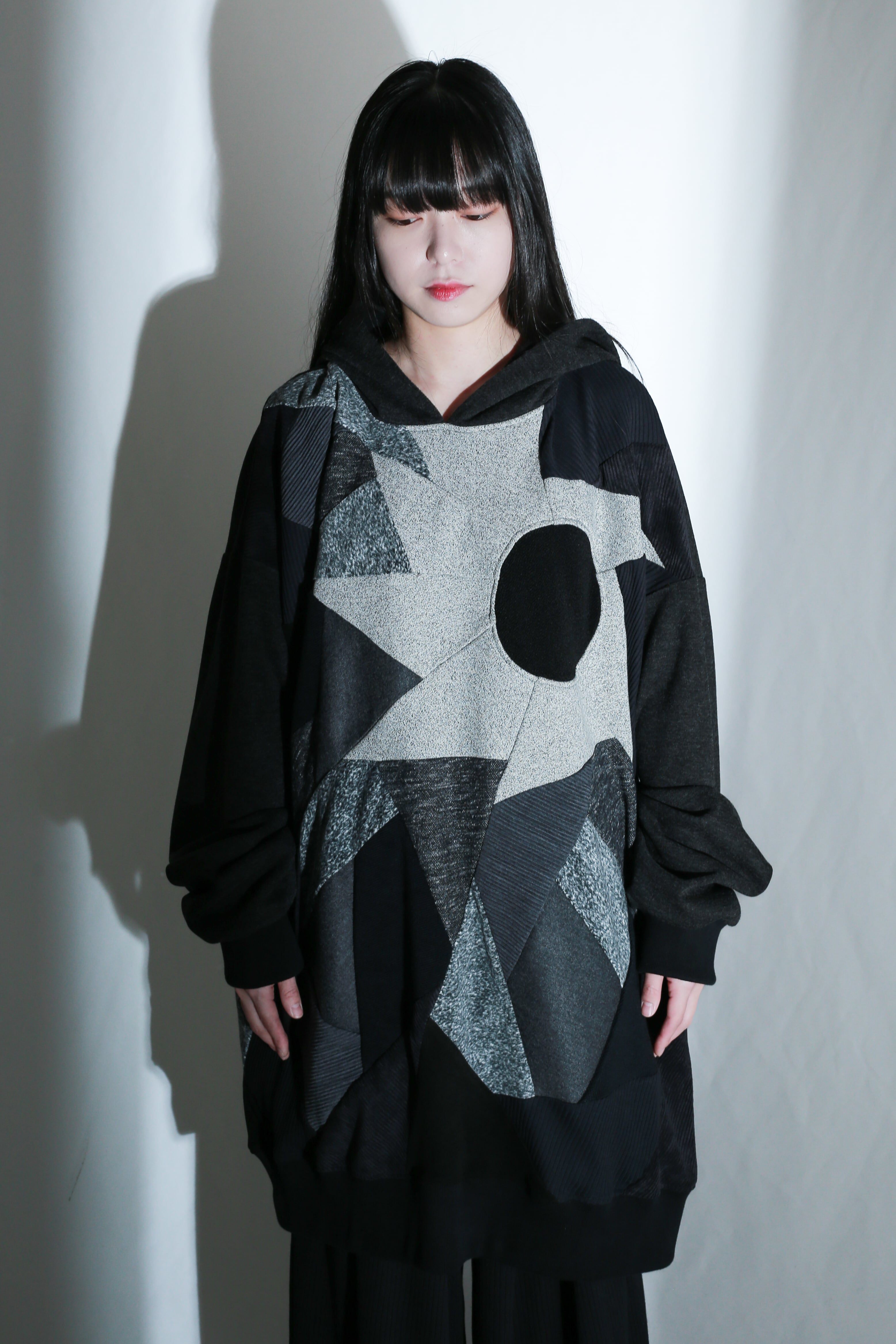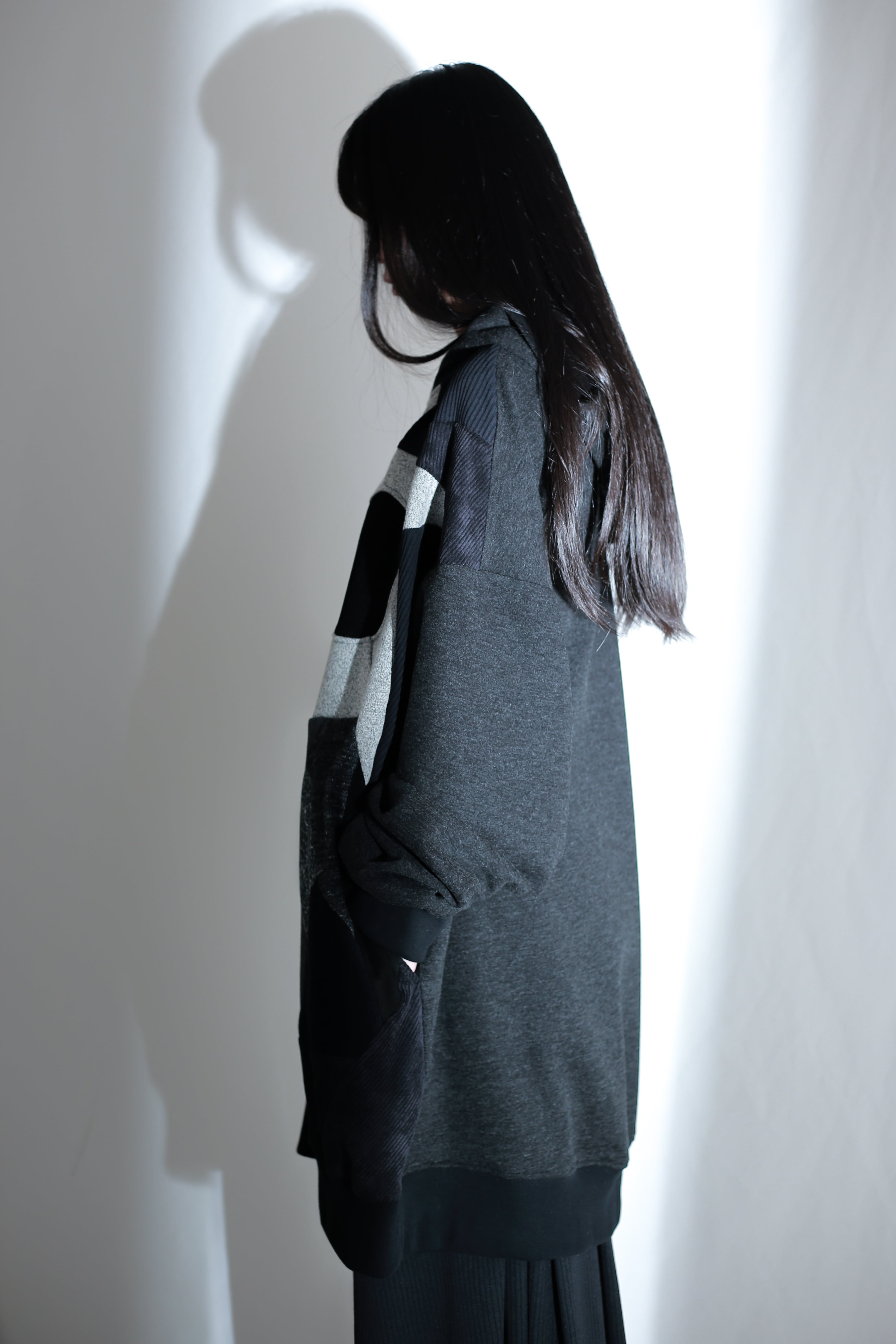 前身頃に施されたパッチワークが印象的な一着。