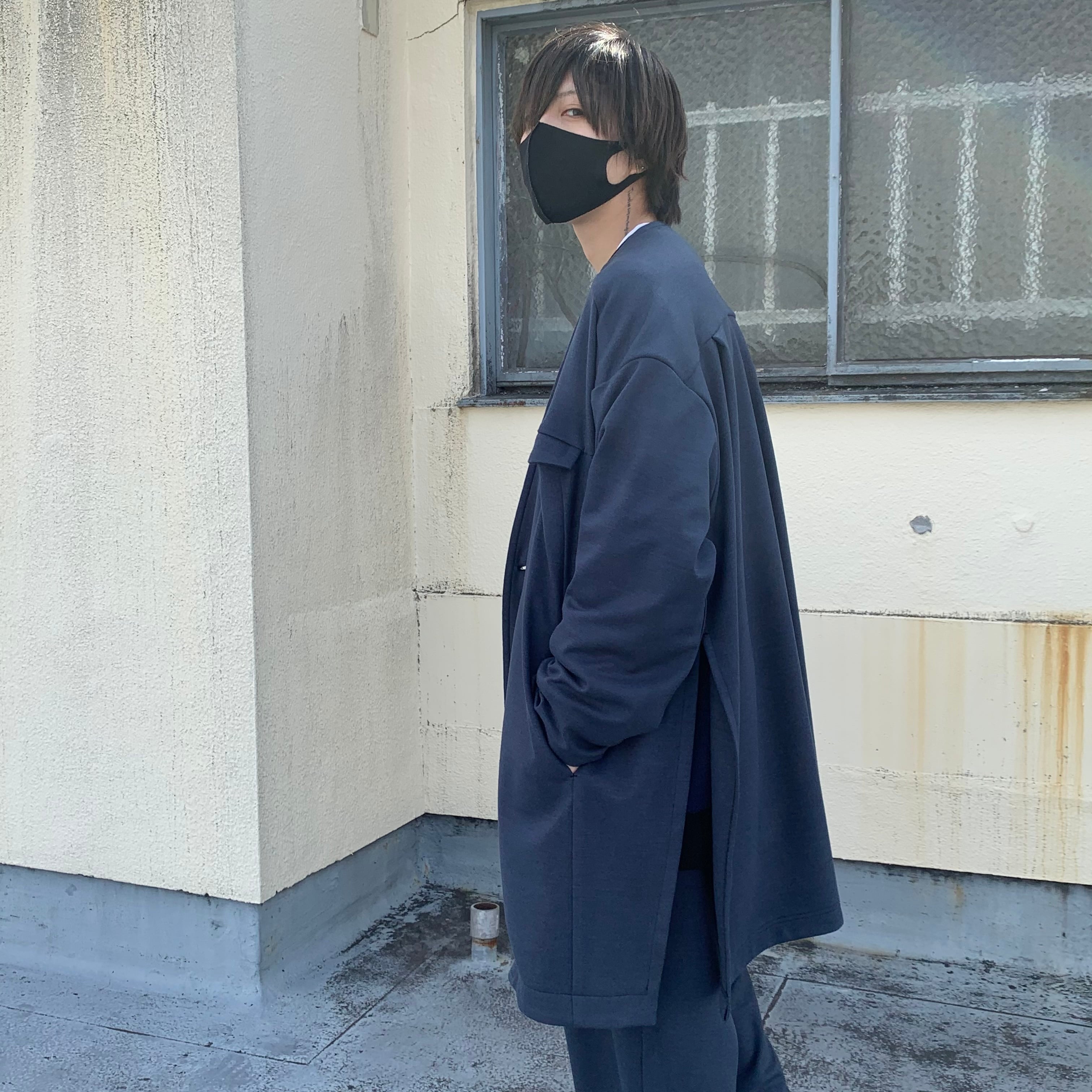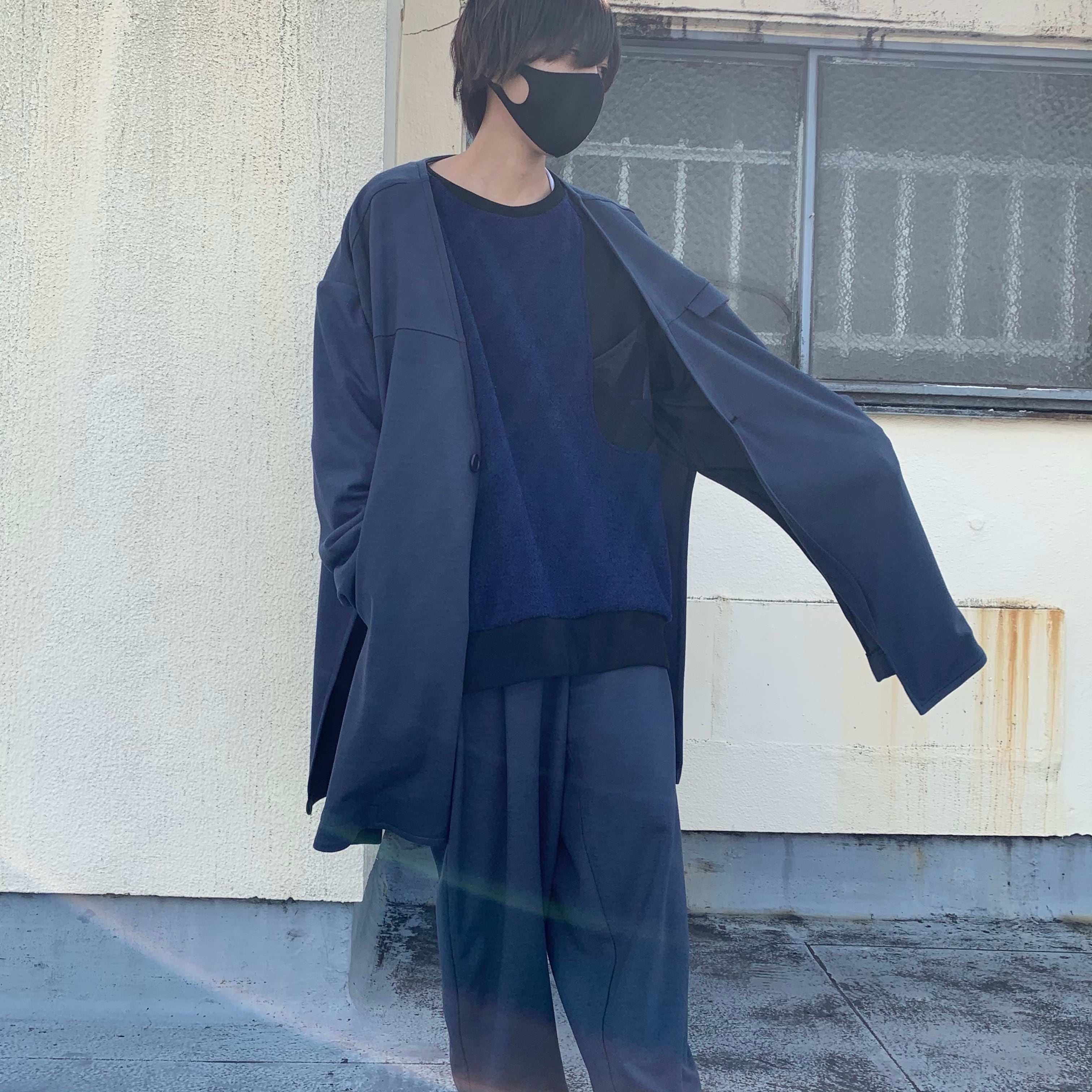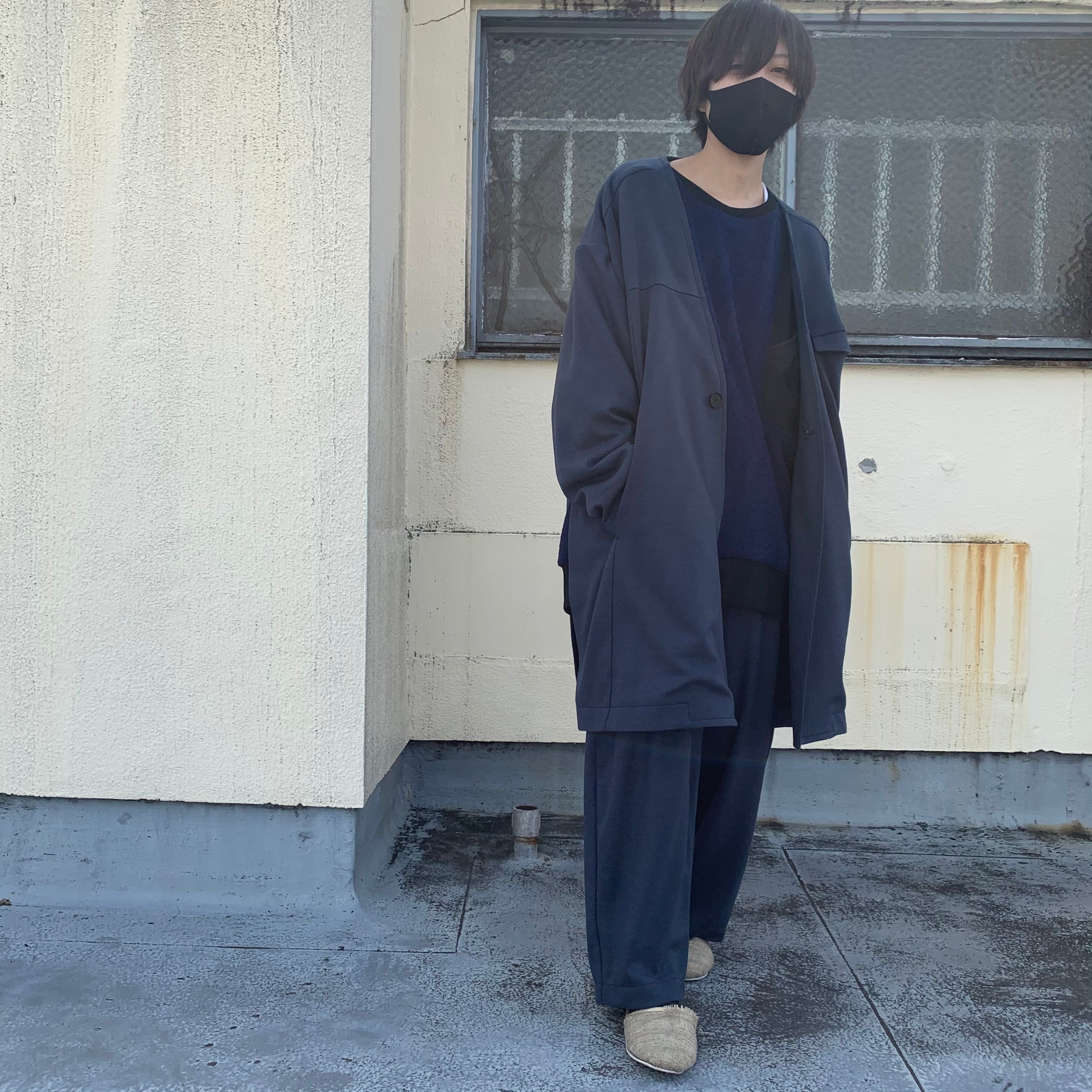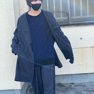 ノーカラーのスッキリとしたジャケットで、脇の大きく開いたスリットが特徴です。