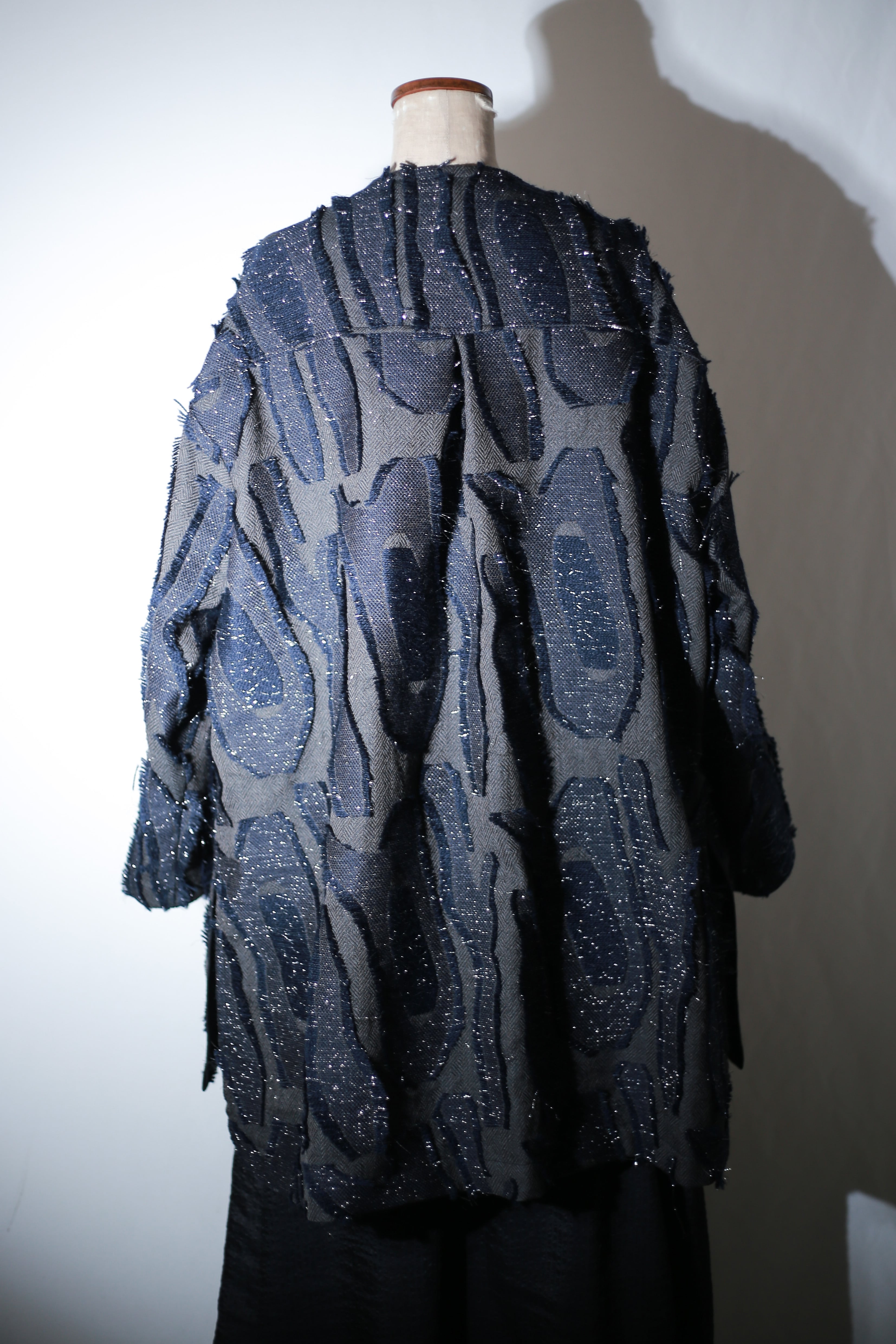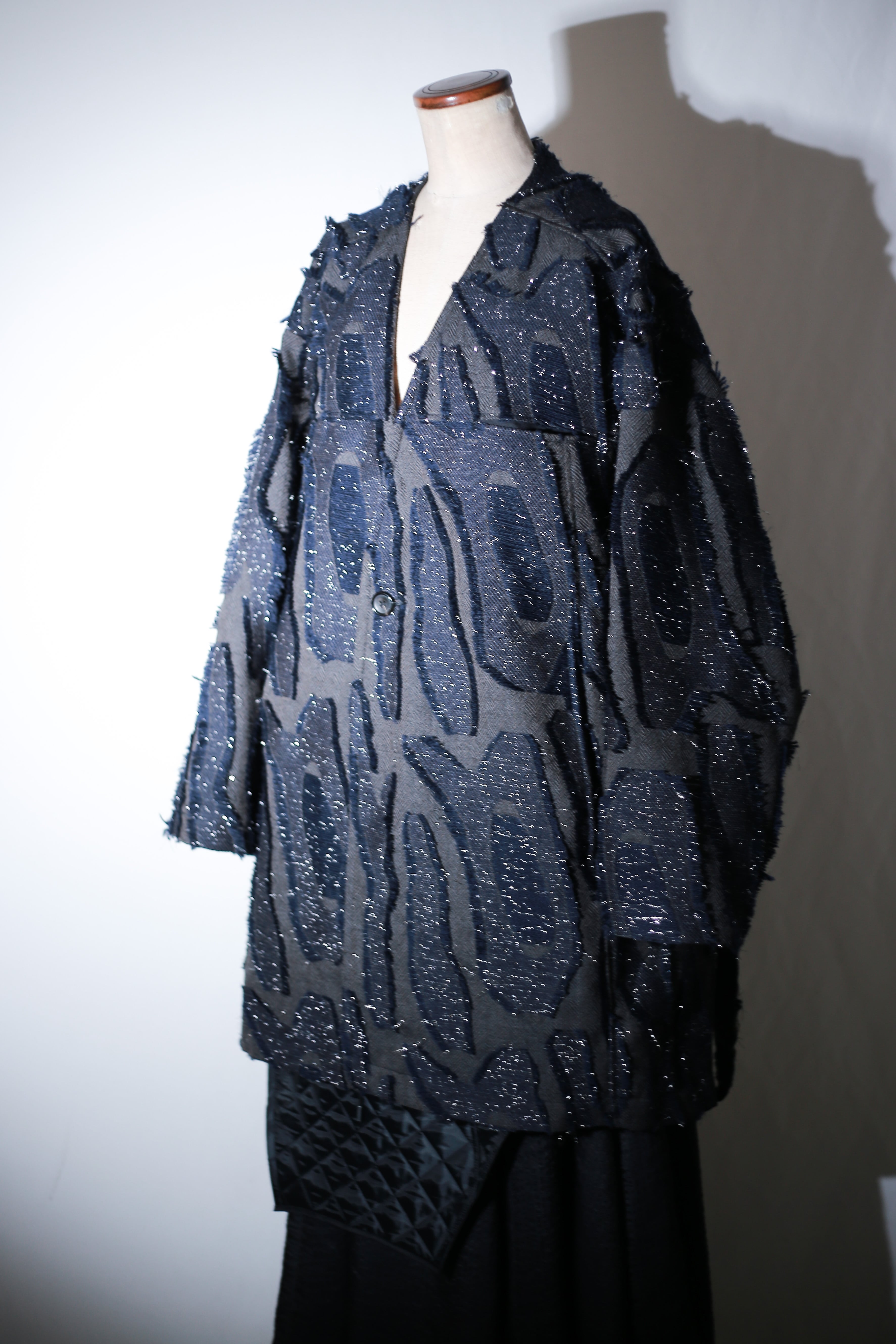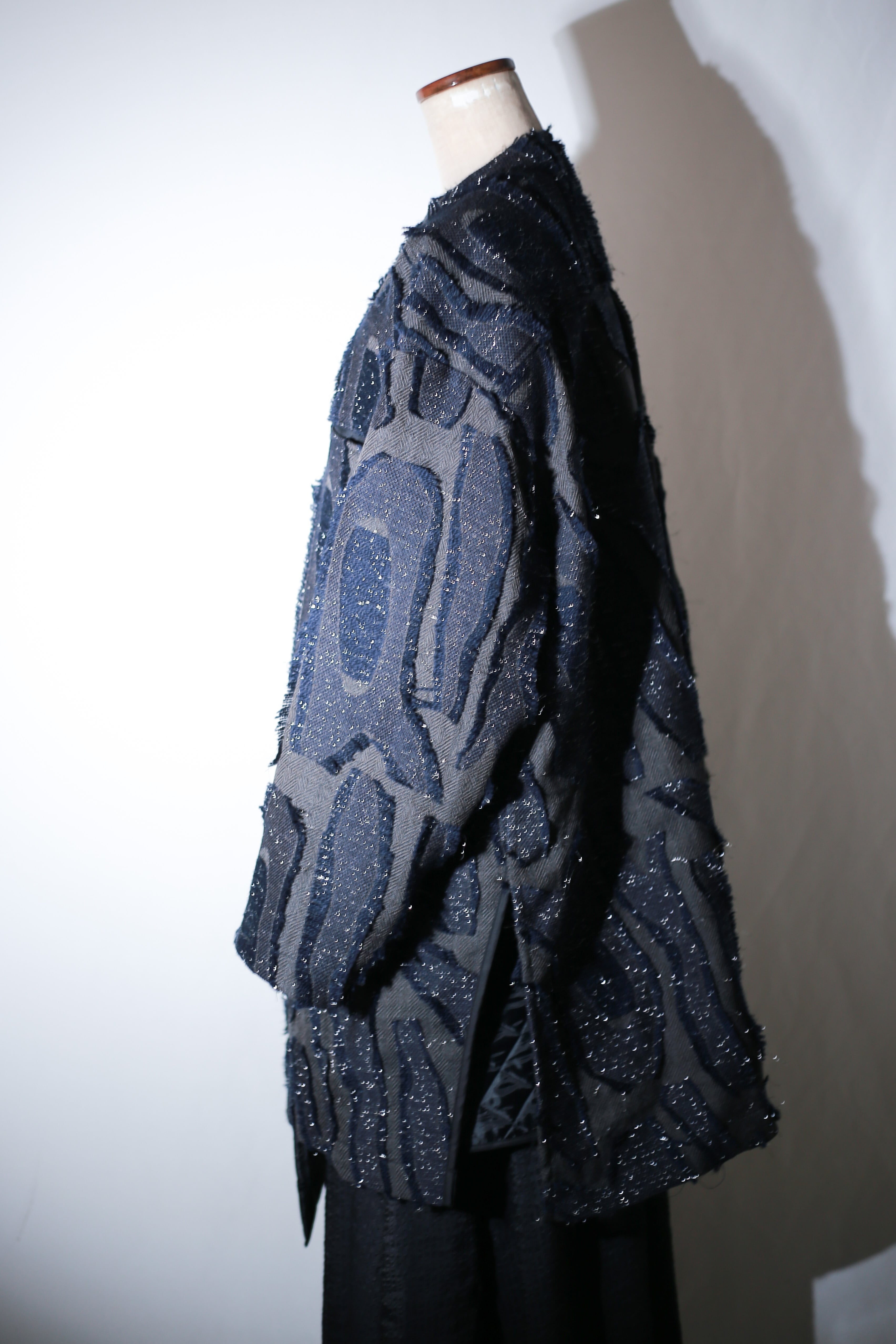 ノーカラーのスッキリとしたジャケットで、脇の大きく開いたスリットが特徴です。
