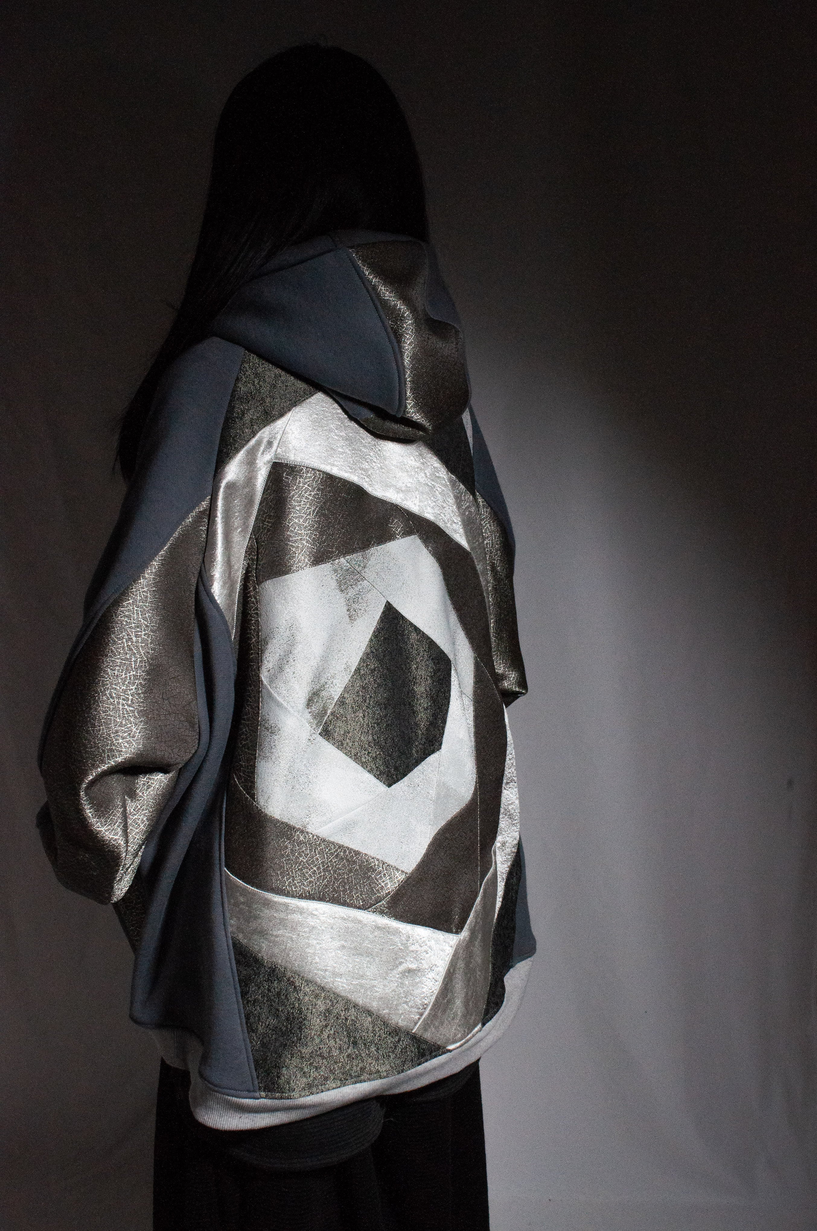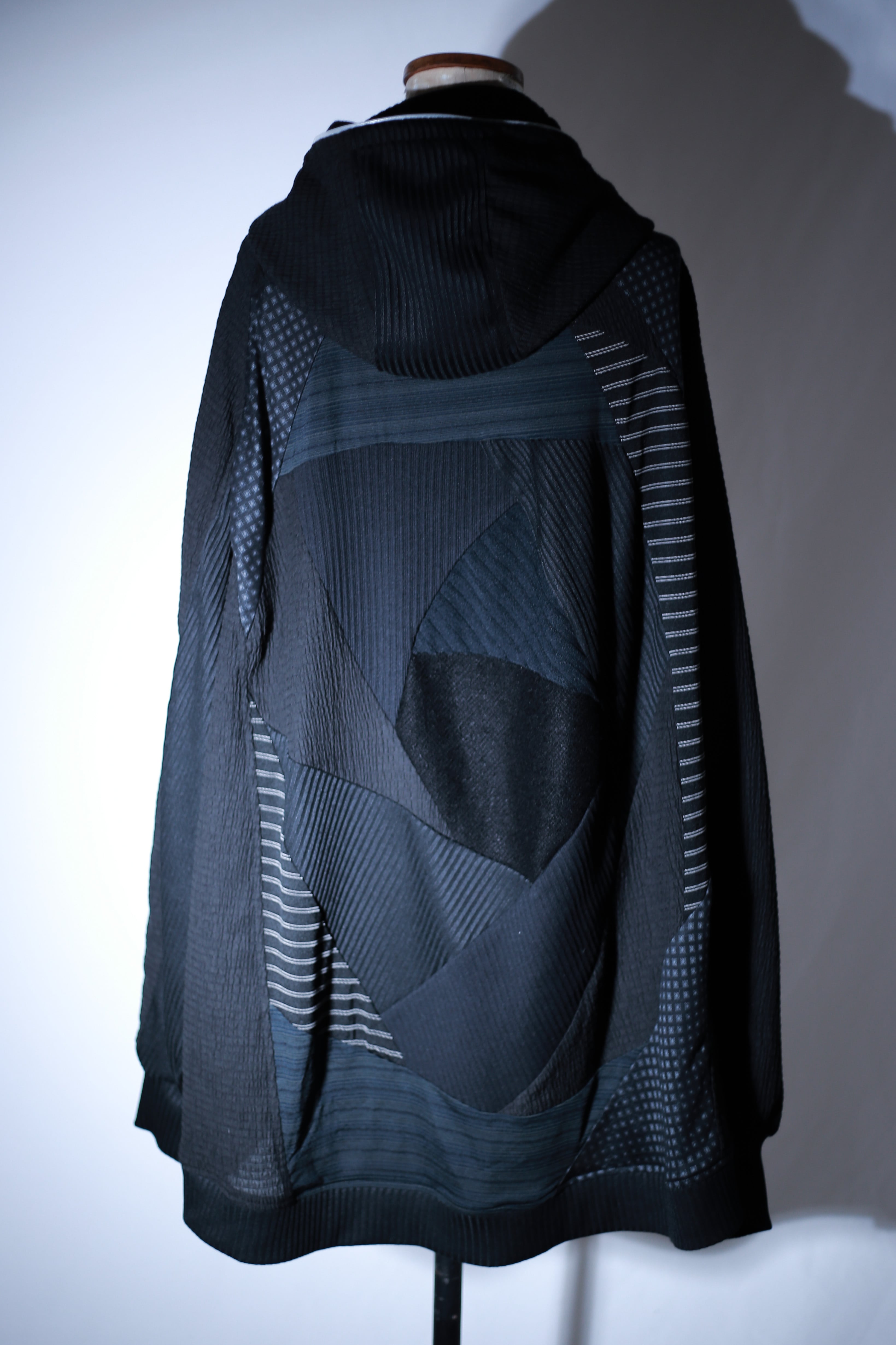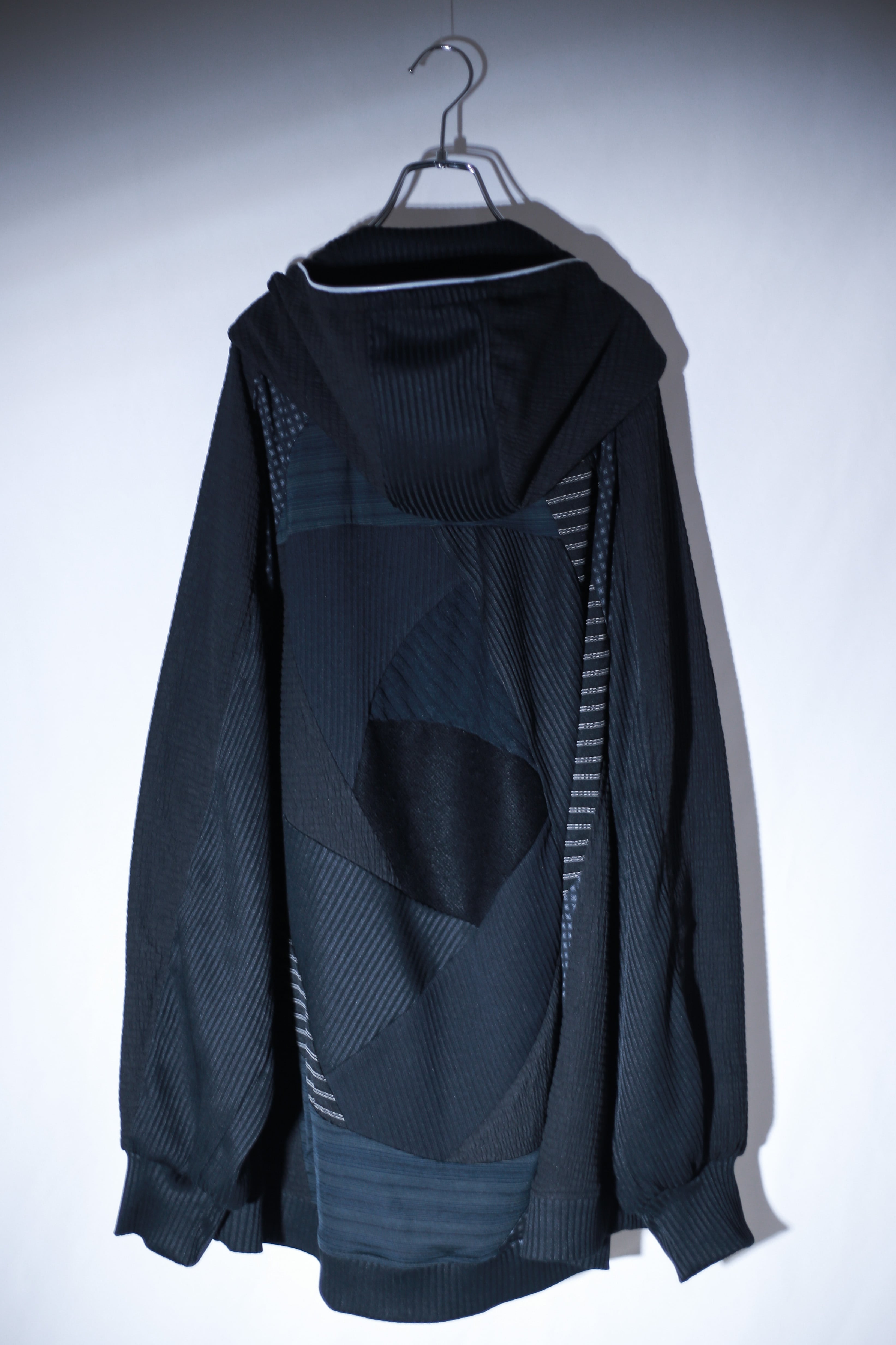対して背面には、大胆なパッチワークを配置。