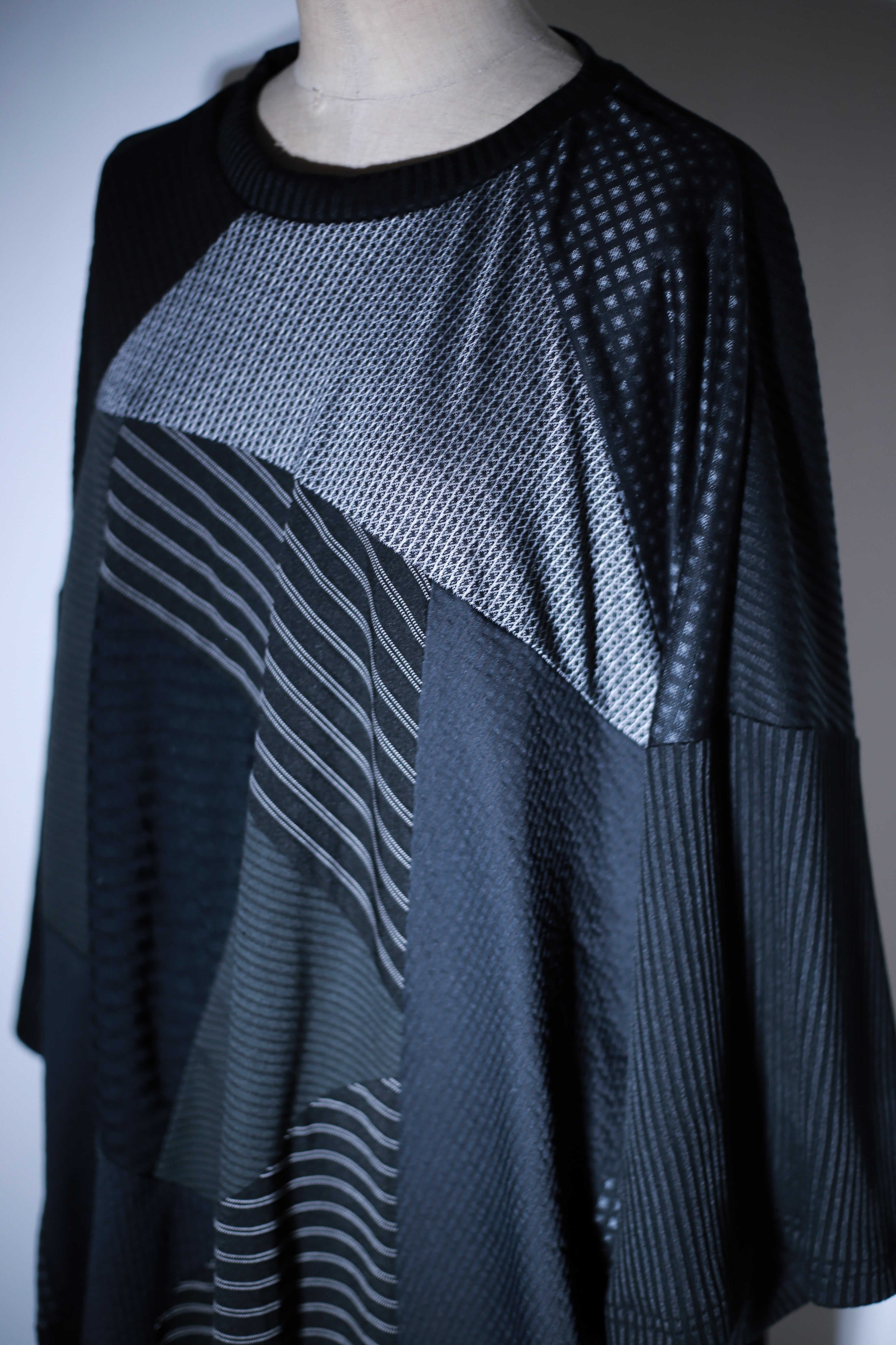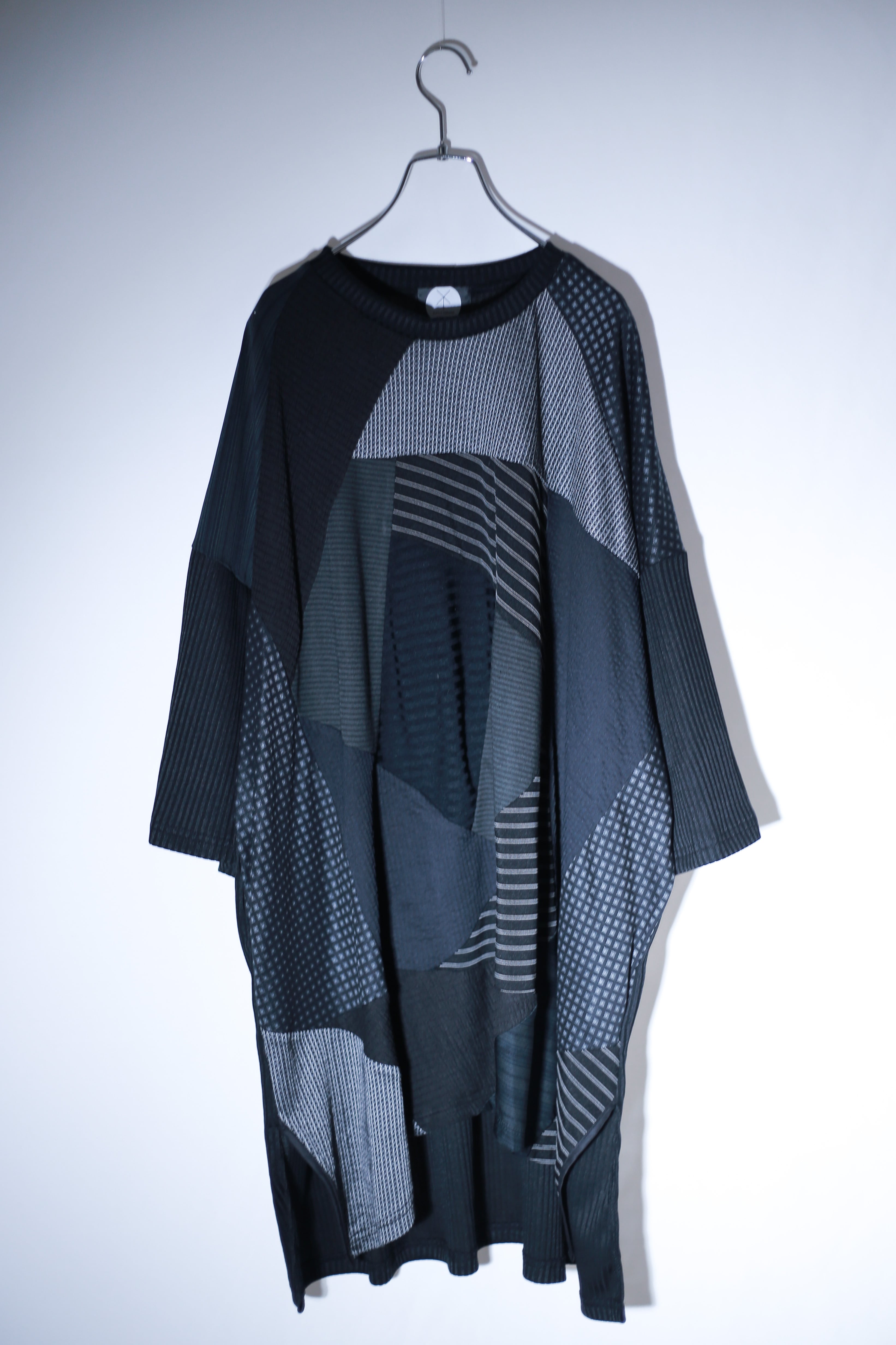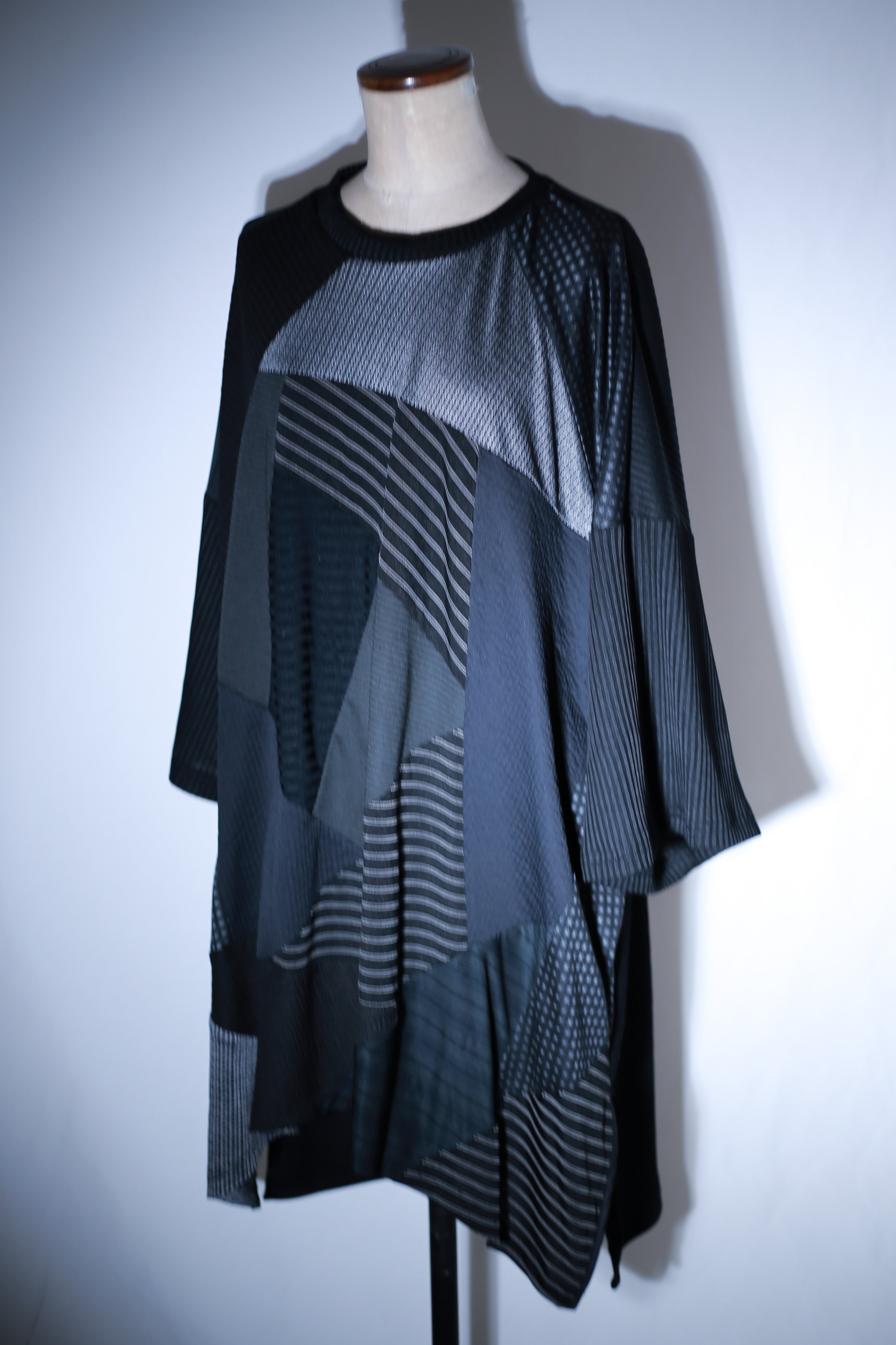 フロントに大胆なパッチワークを施したデザインが印象的な一着。