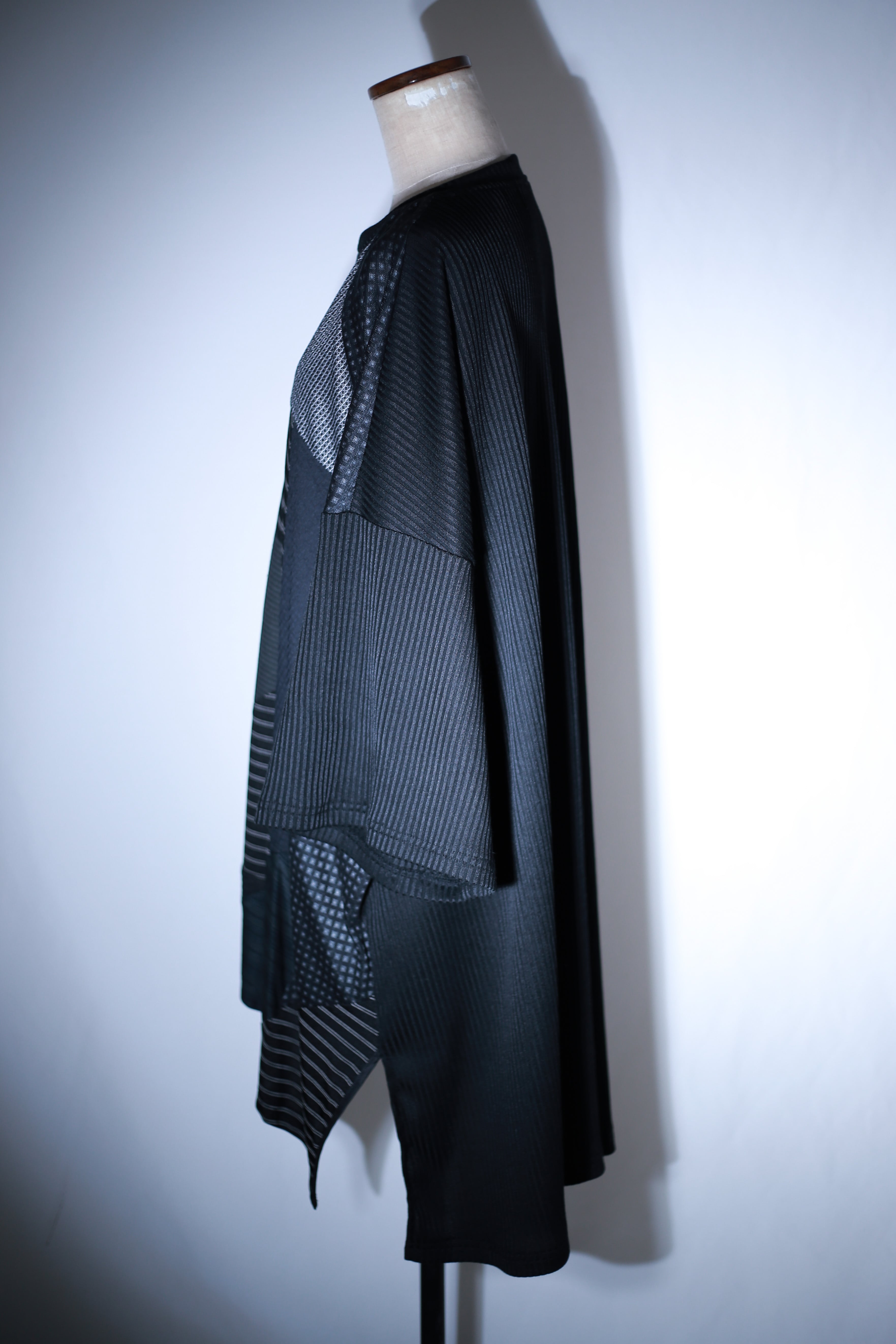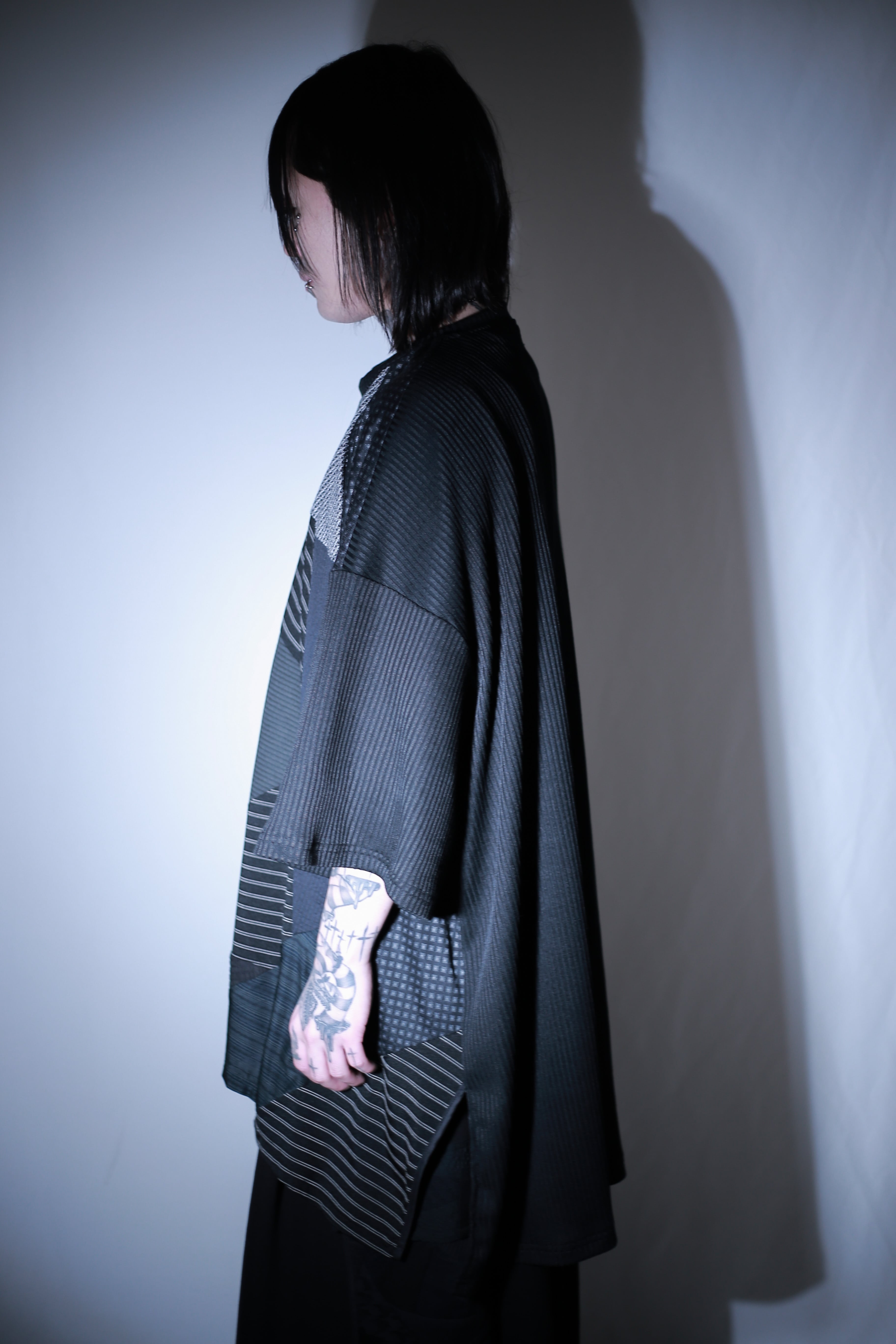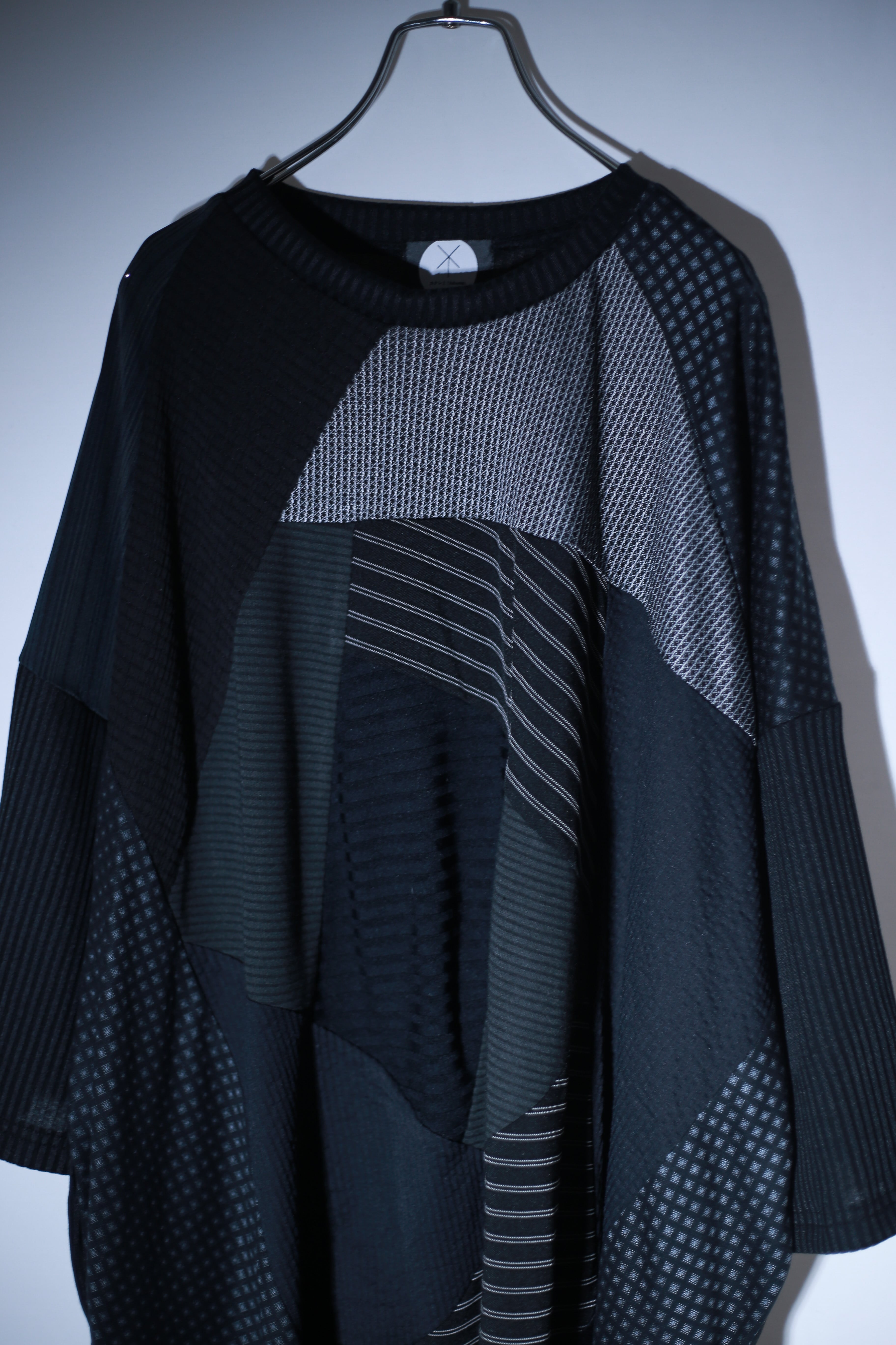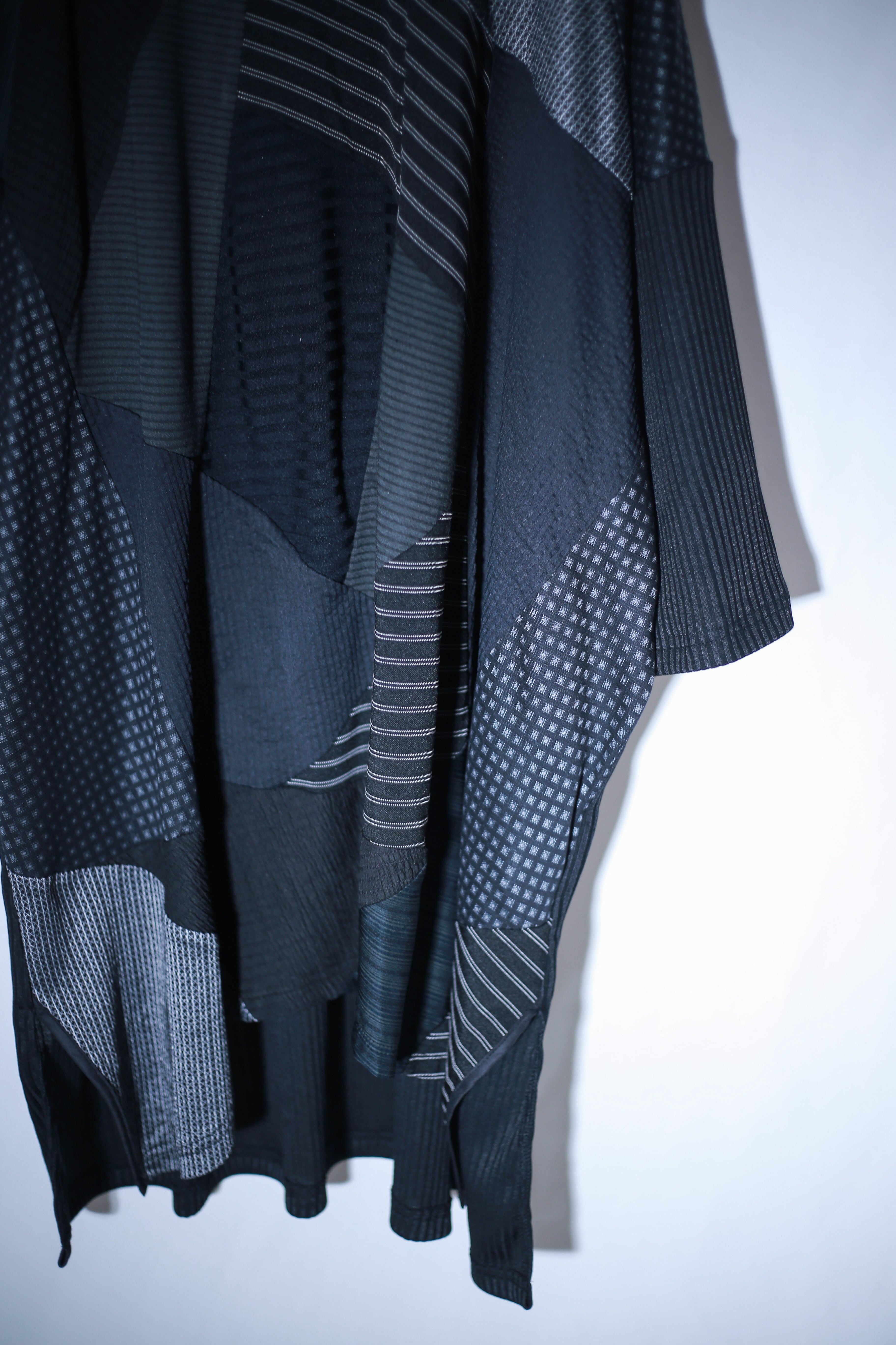 フロントに大胆なパッチワークを施したデザインが印象的な一着。