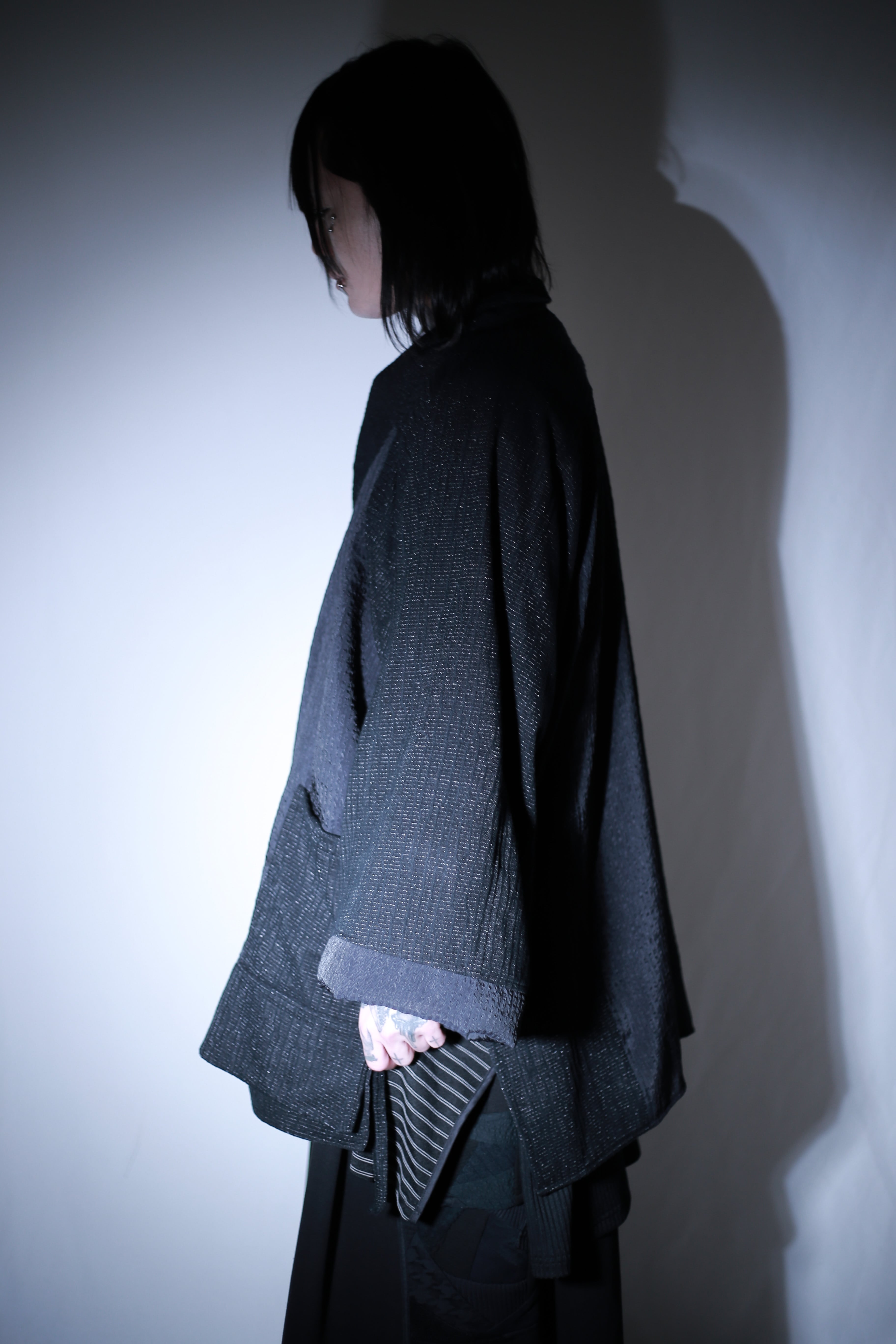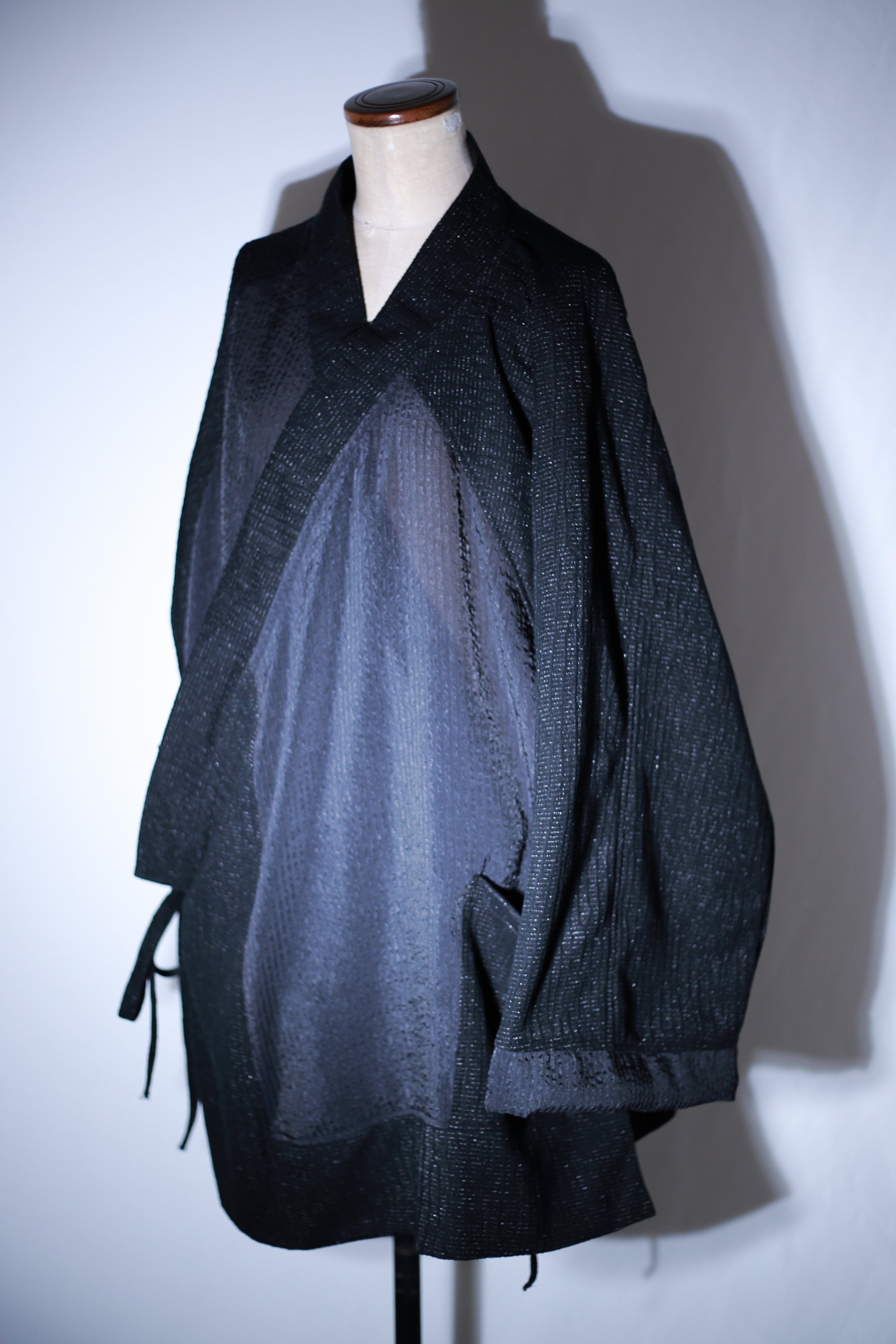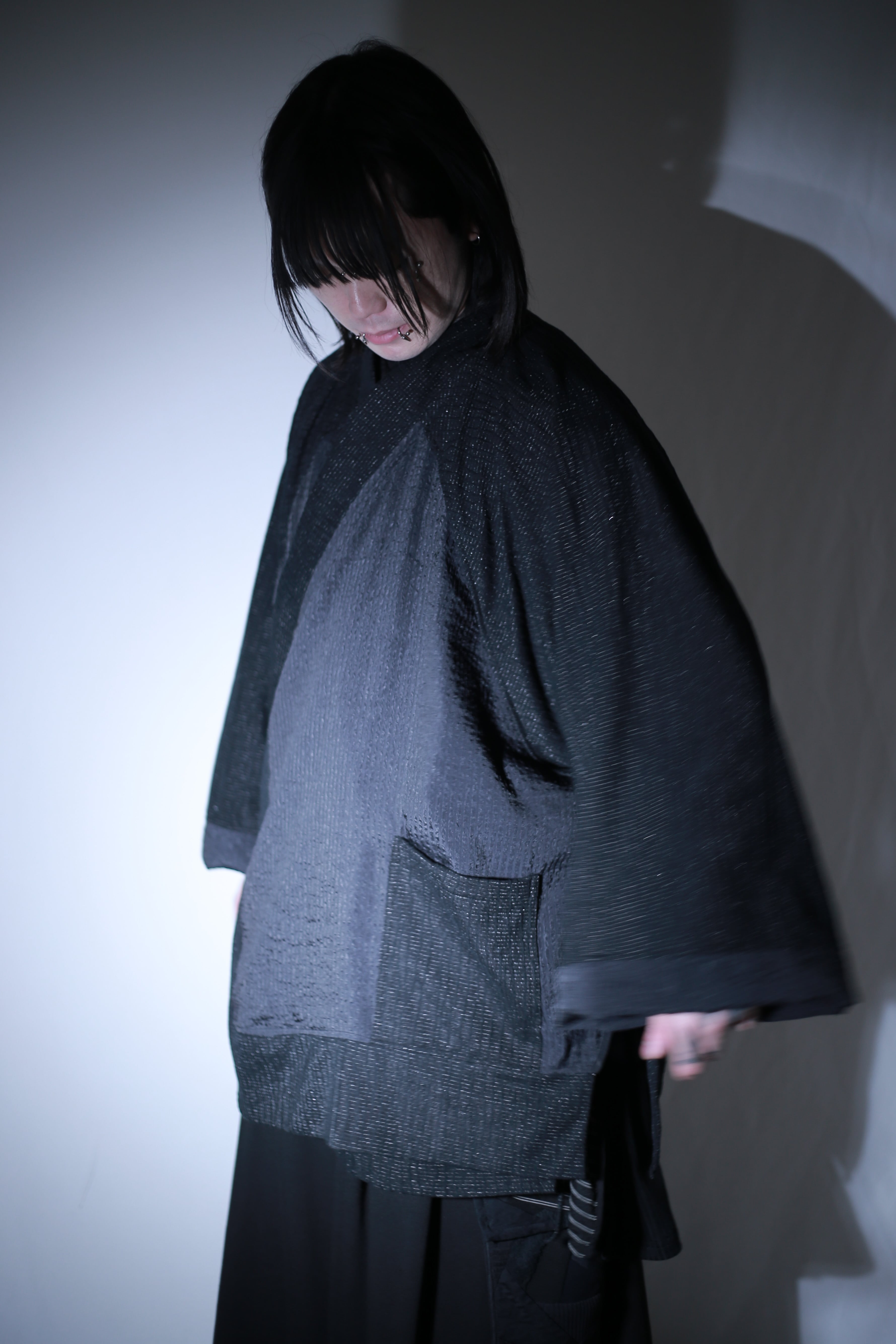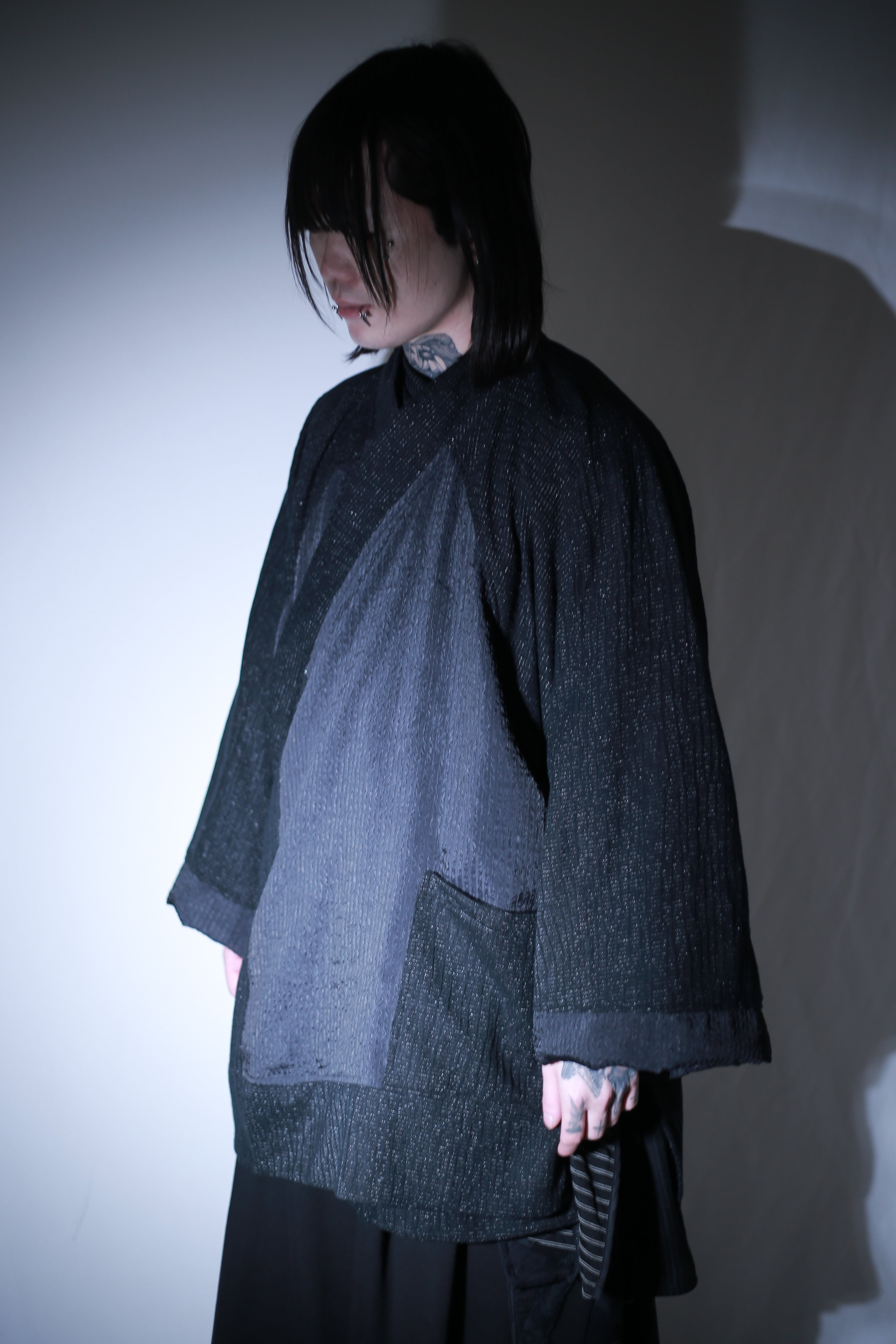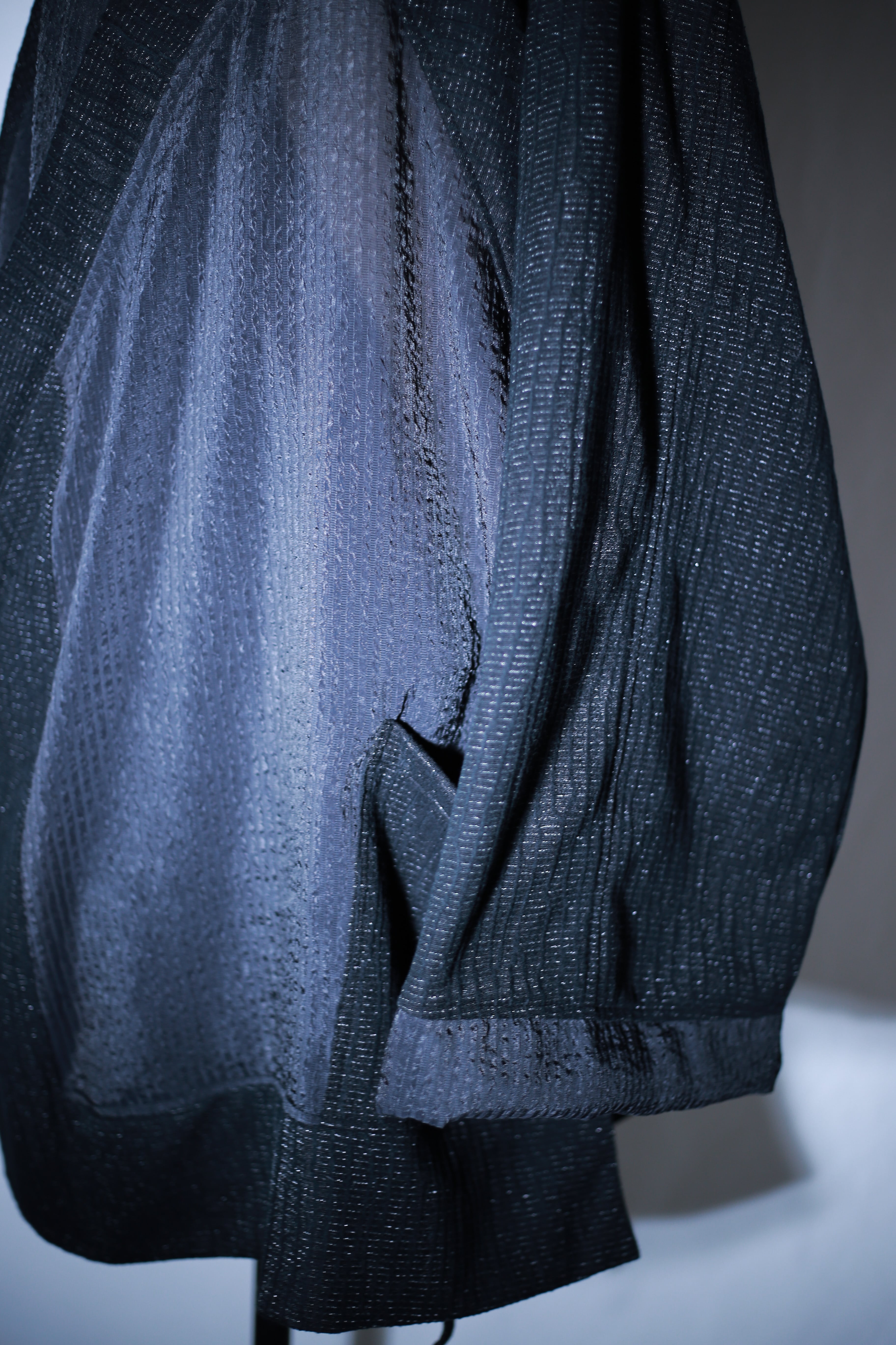 作務衣をモチーフに制作をしており、袖はキモノスリーブにすることにより袖下の生地のたまりが独特なシルエットを表現します。また、袖口も広く設定しています。