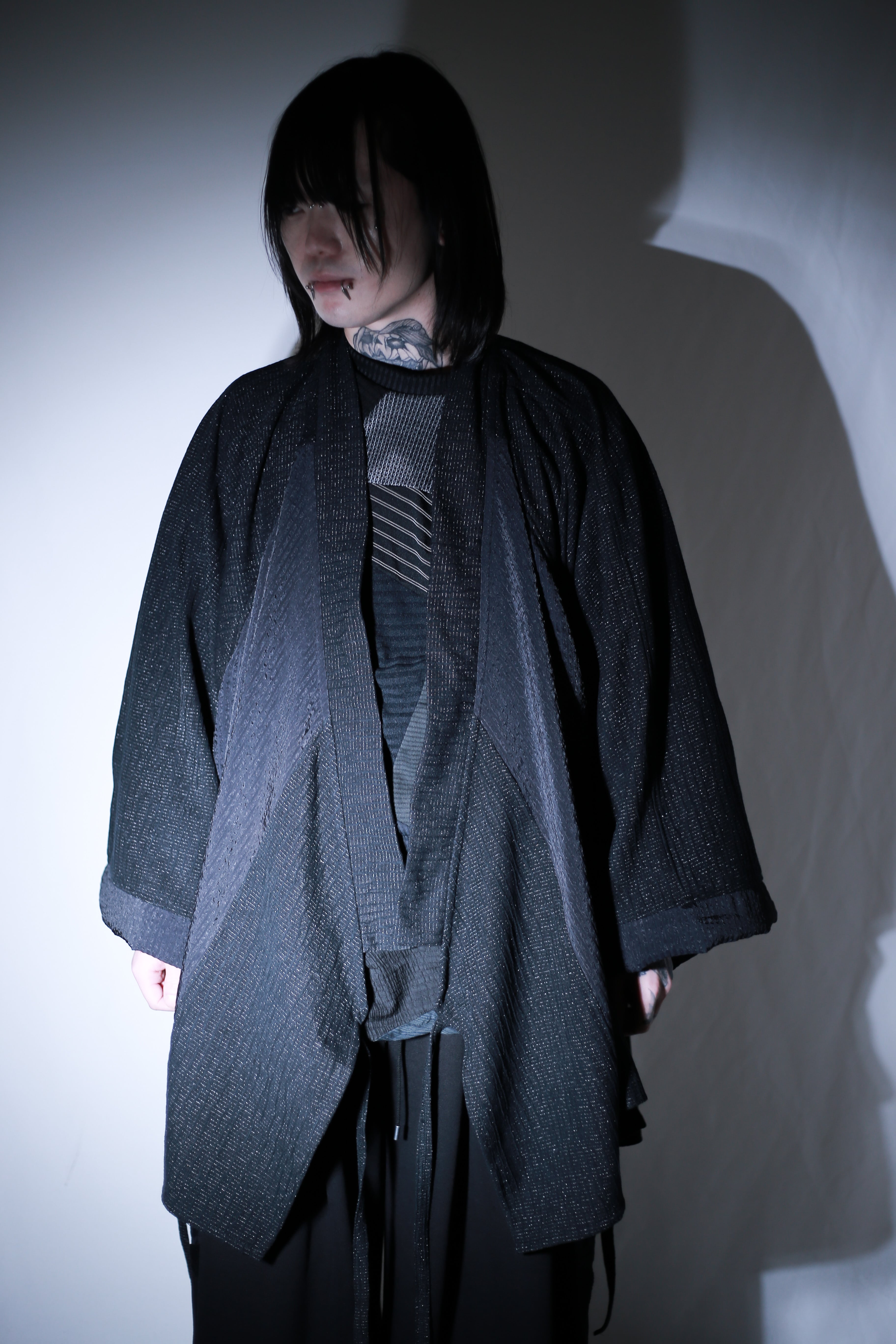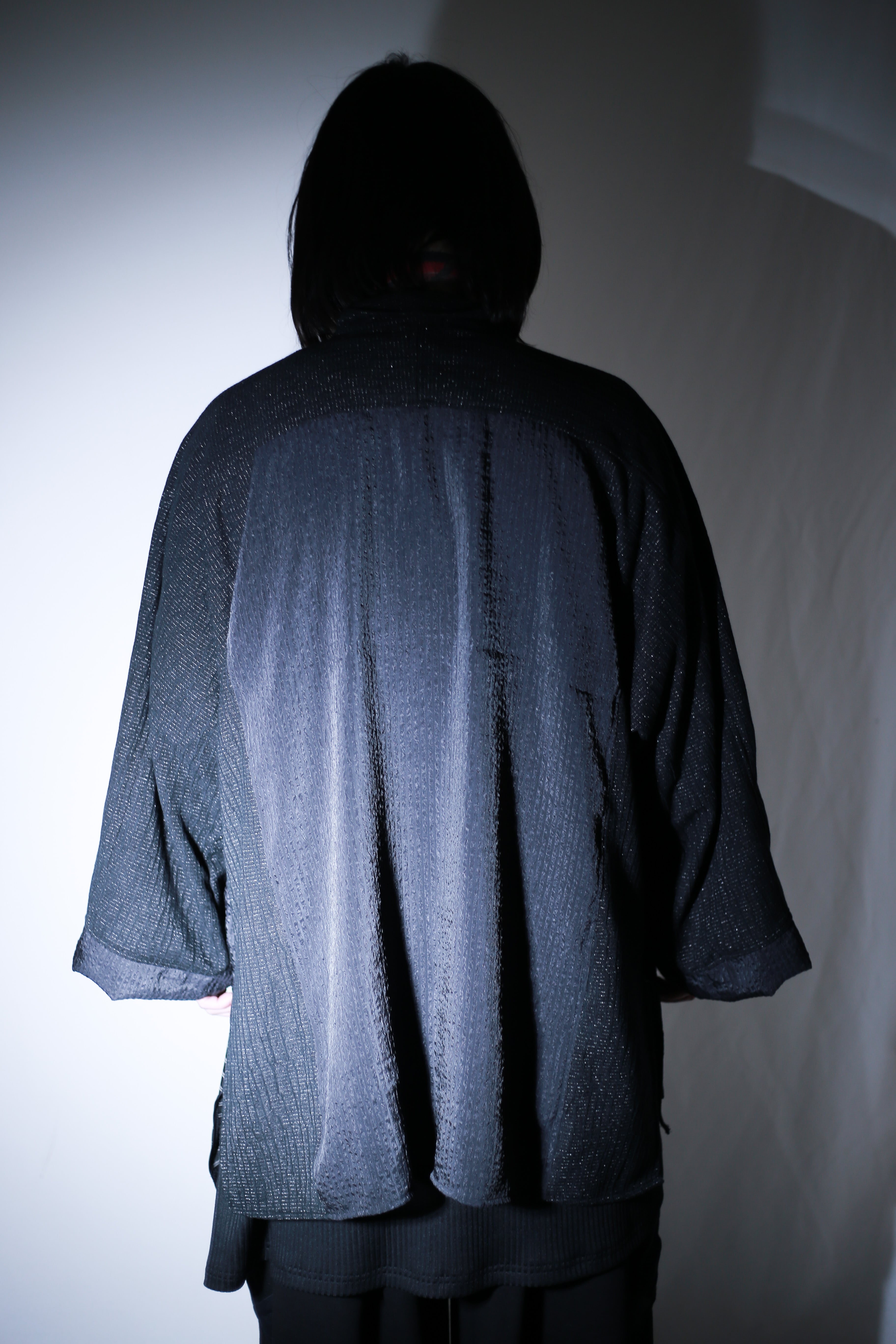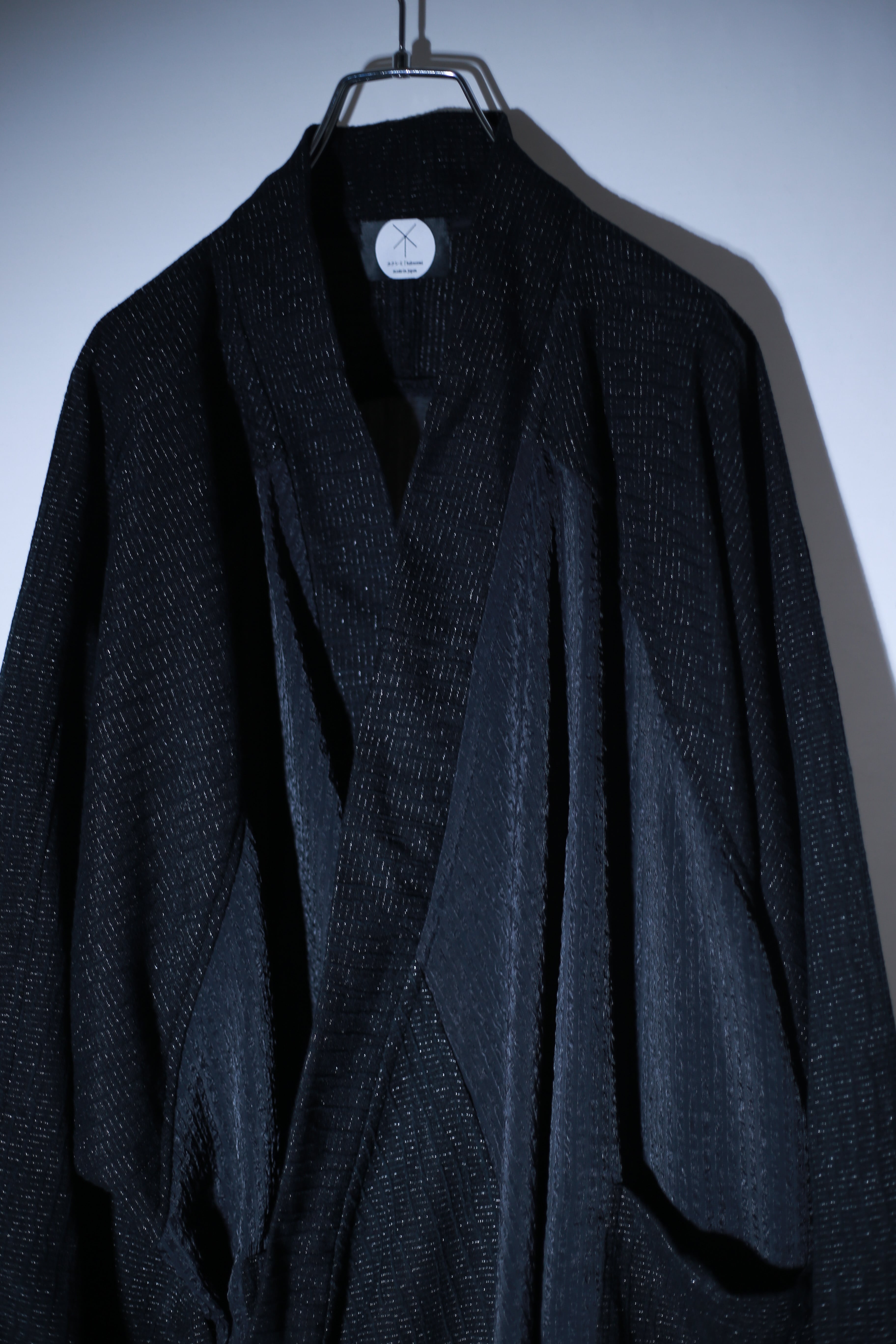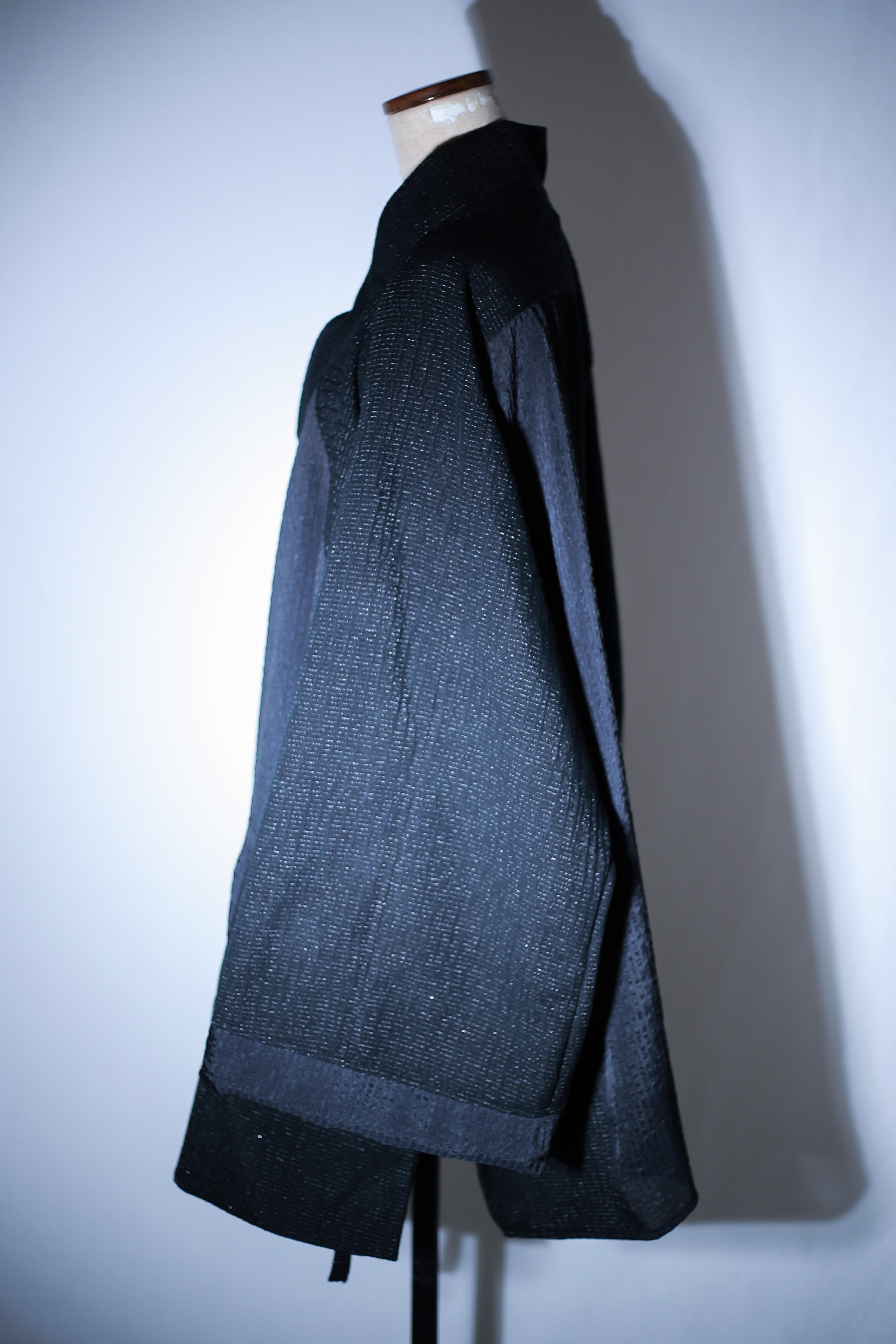作務衣をモチーフに制作をしており、袖はキモノスリーブにすることにより袖下の生地のたまりが独特なシルエットを表現します。また、袖口も広く設定しています。