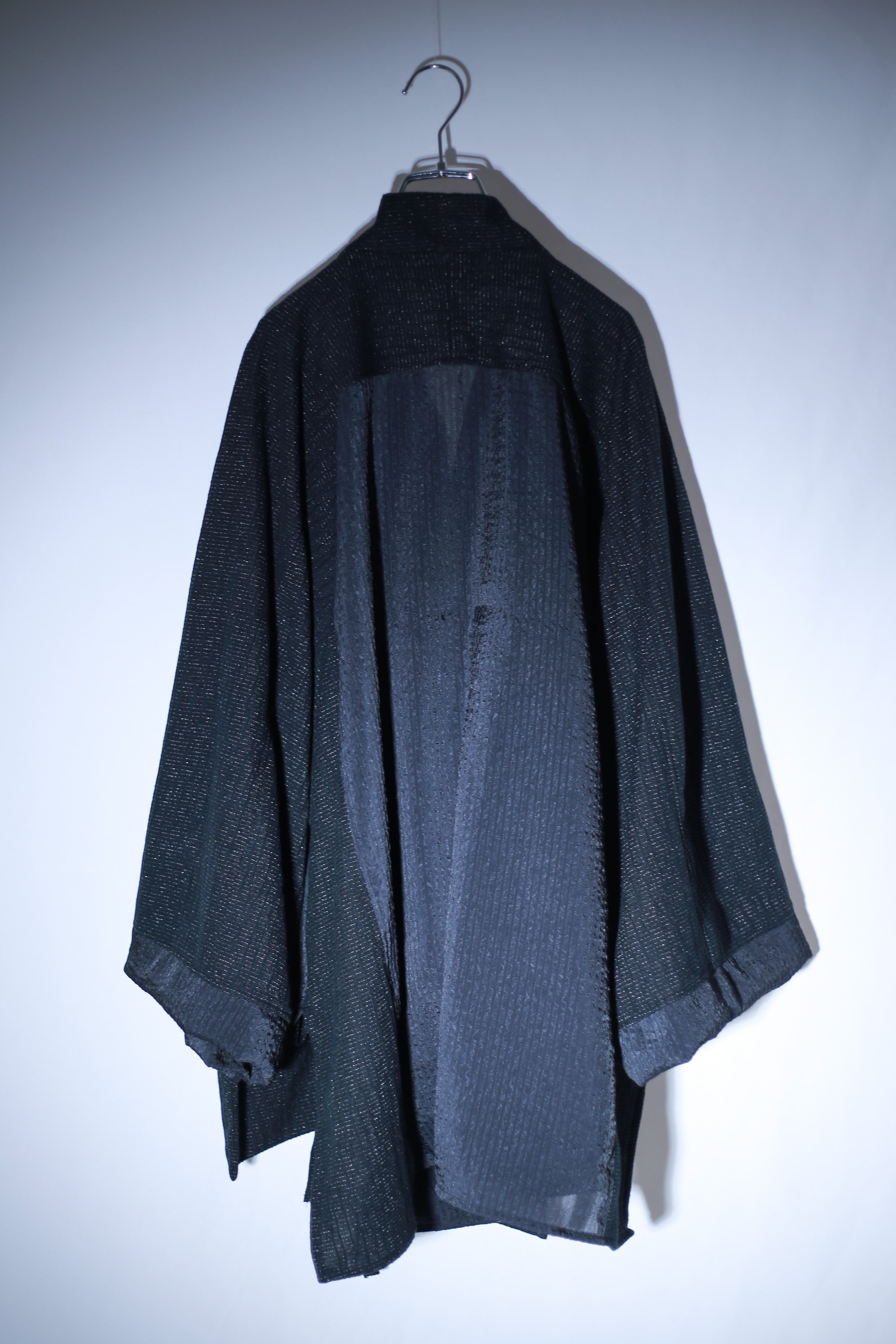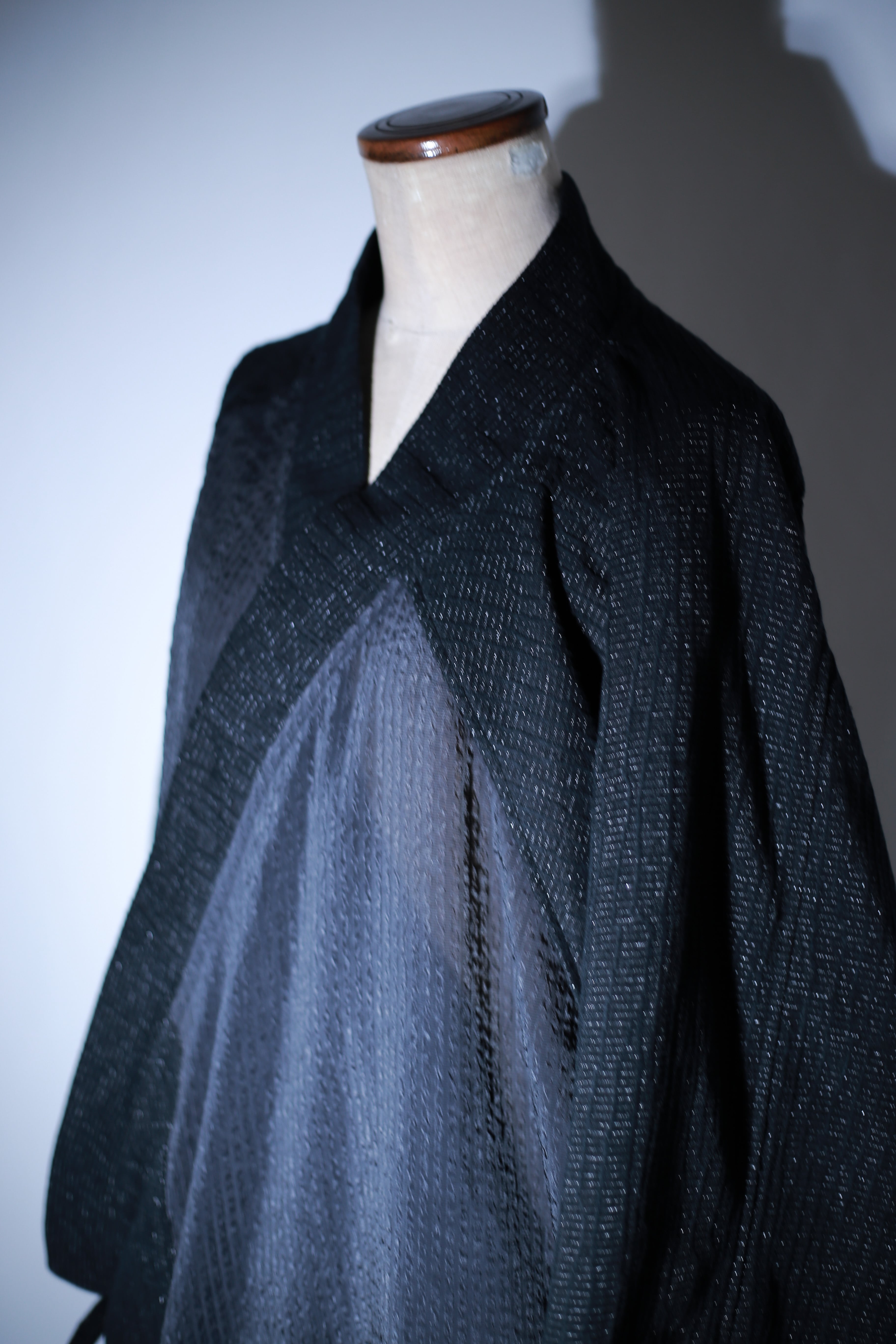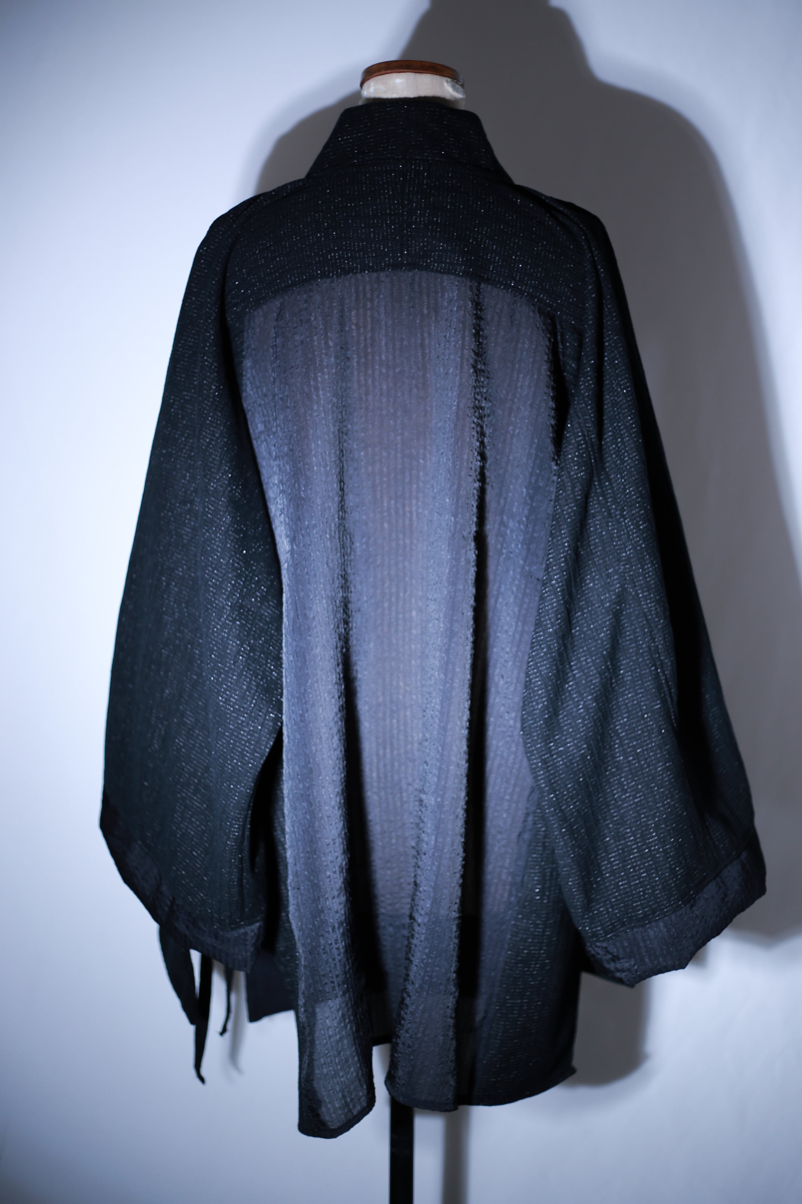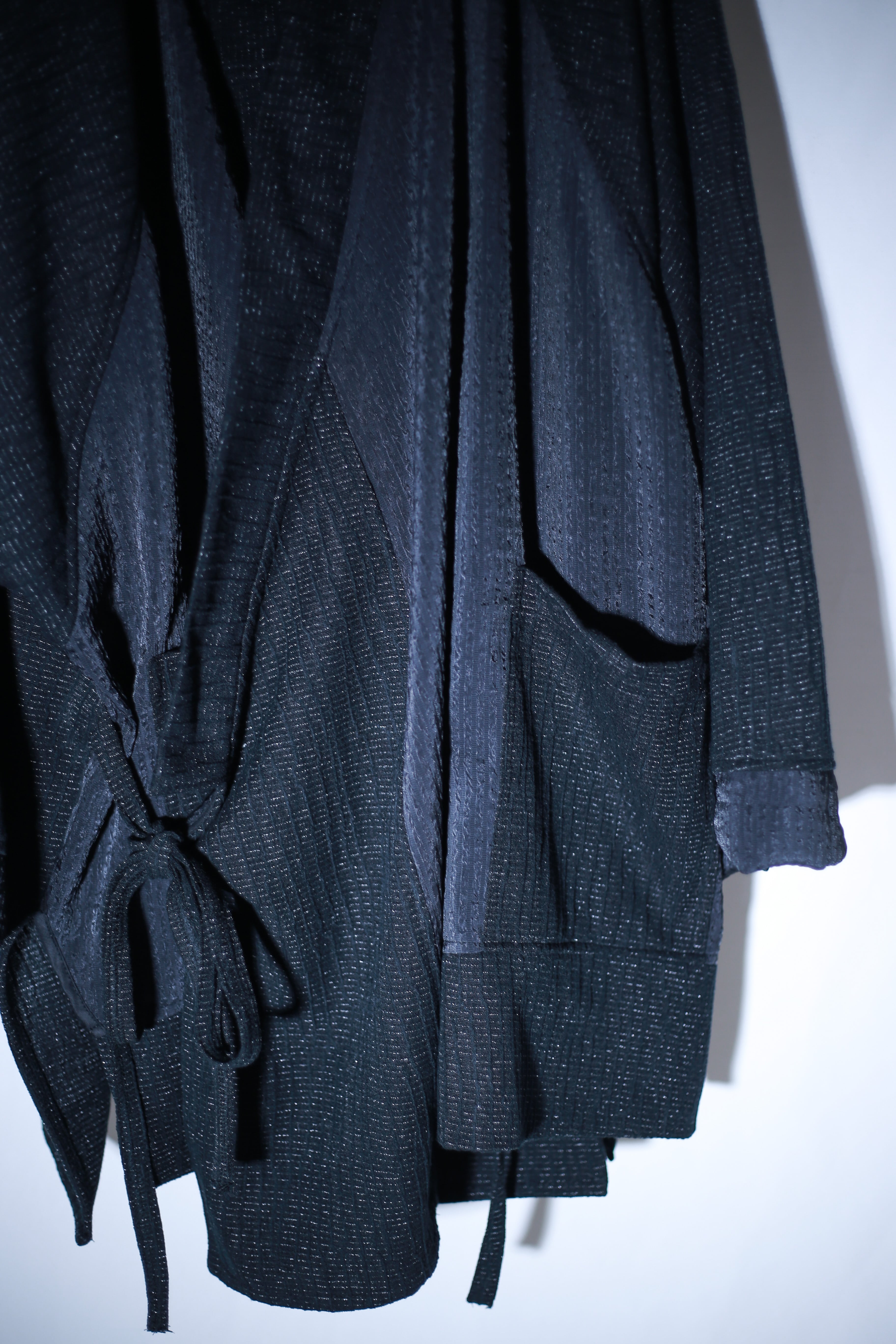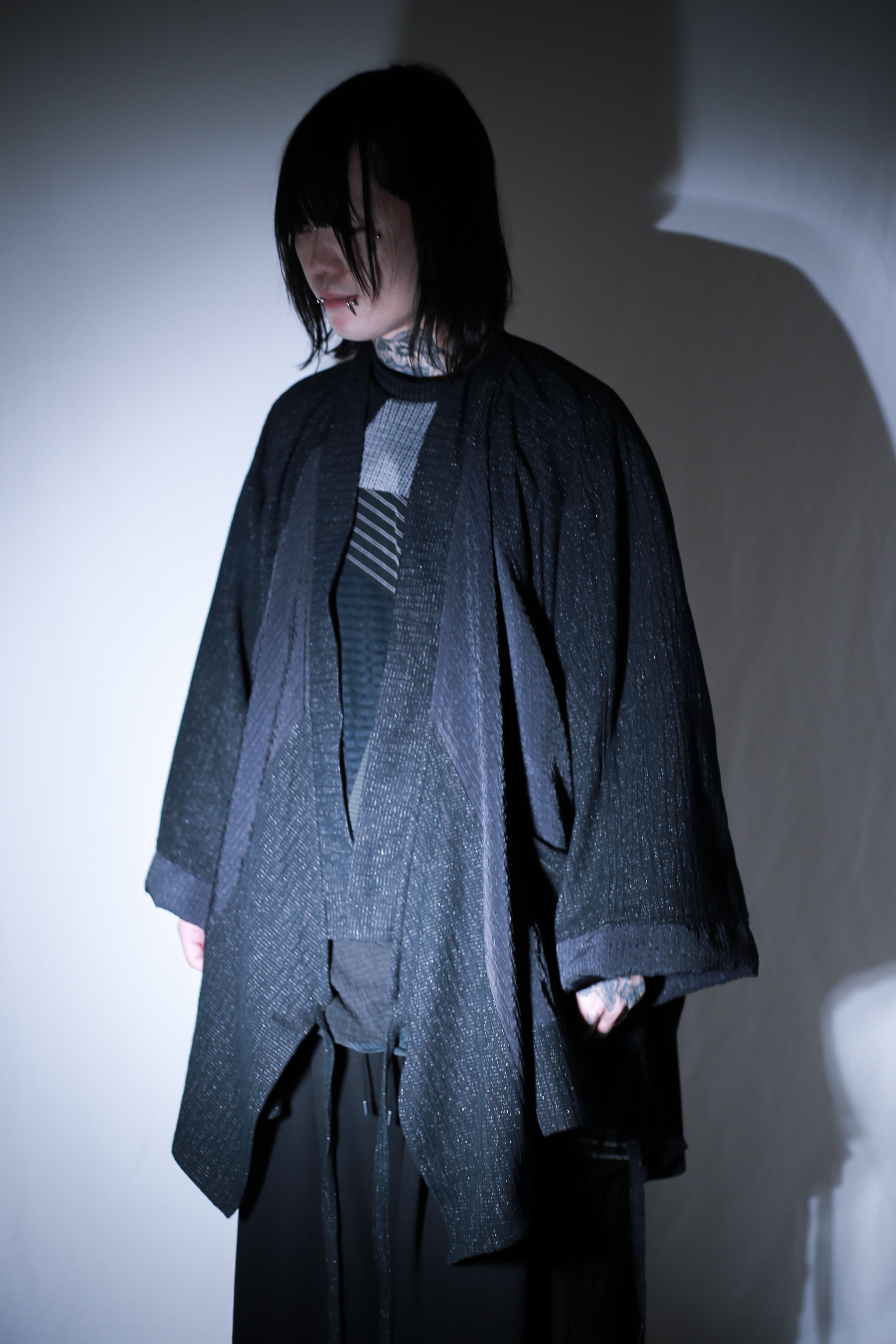 作務衣をモチーフに制作をしており、袖はキモノスリーブにすることにより袖下の生地のたまりが独特なシルエットを表現します。また、袖口も広く設定しています。