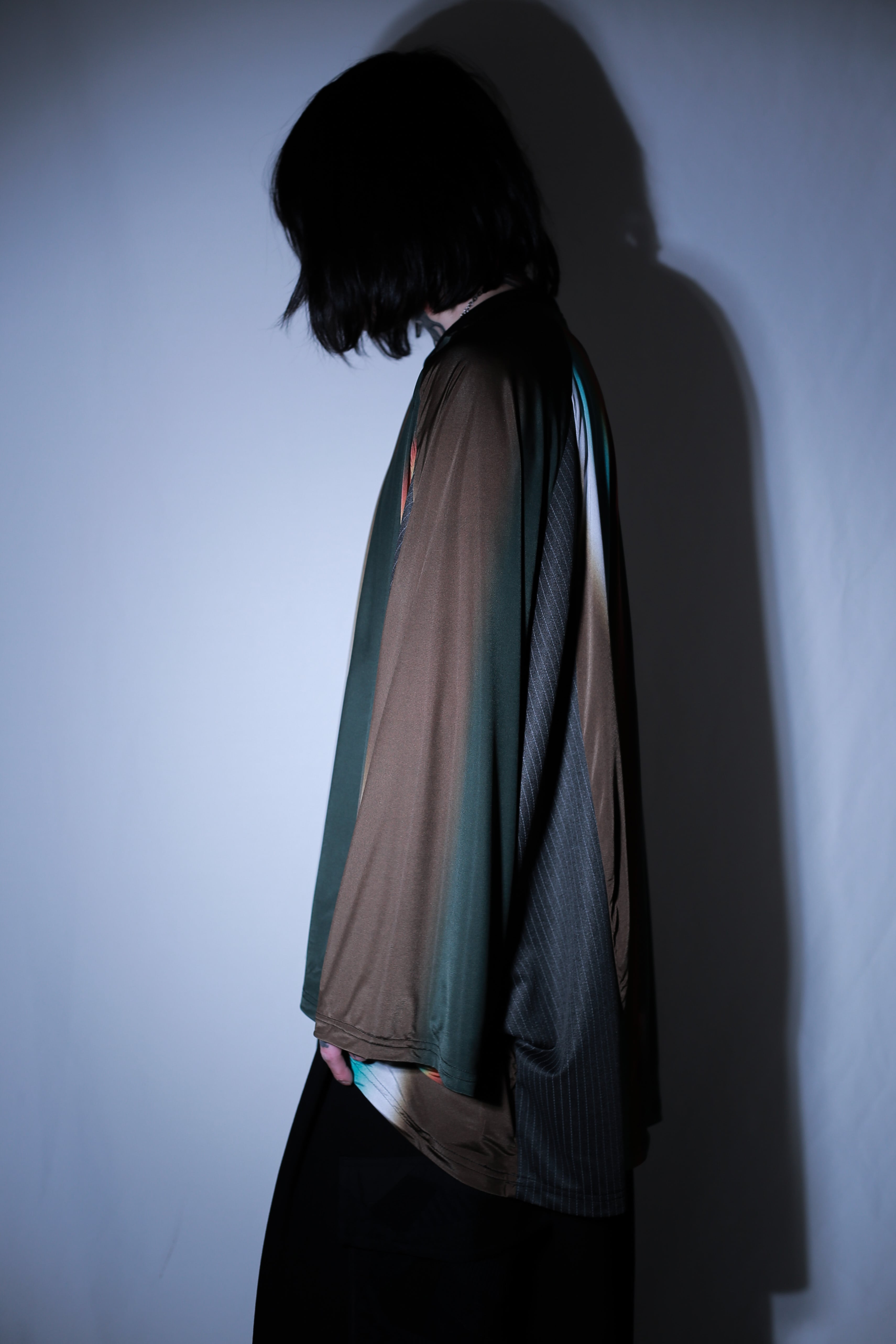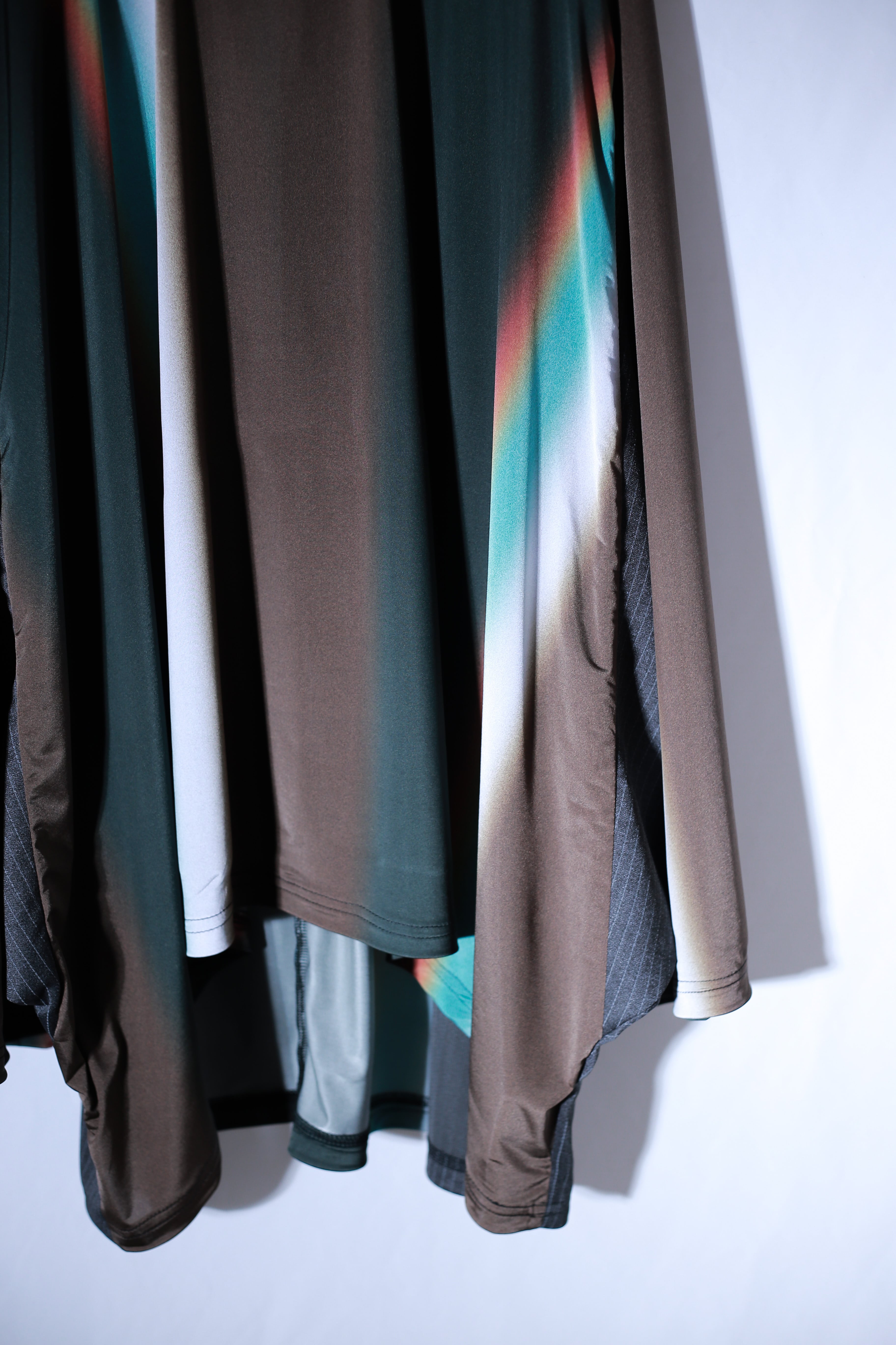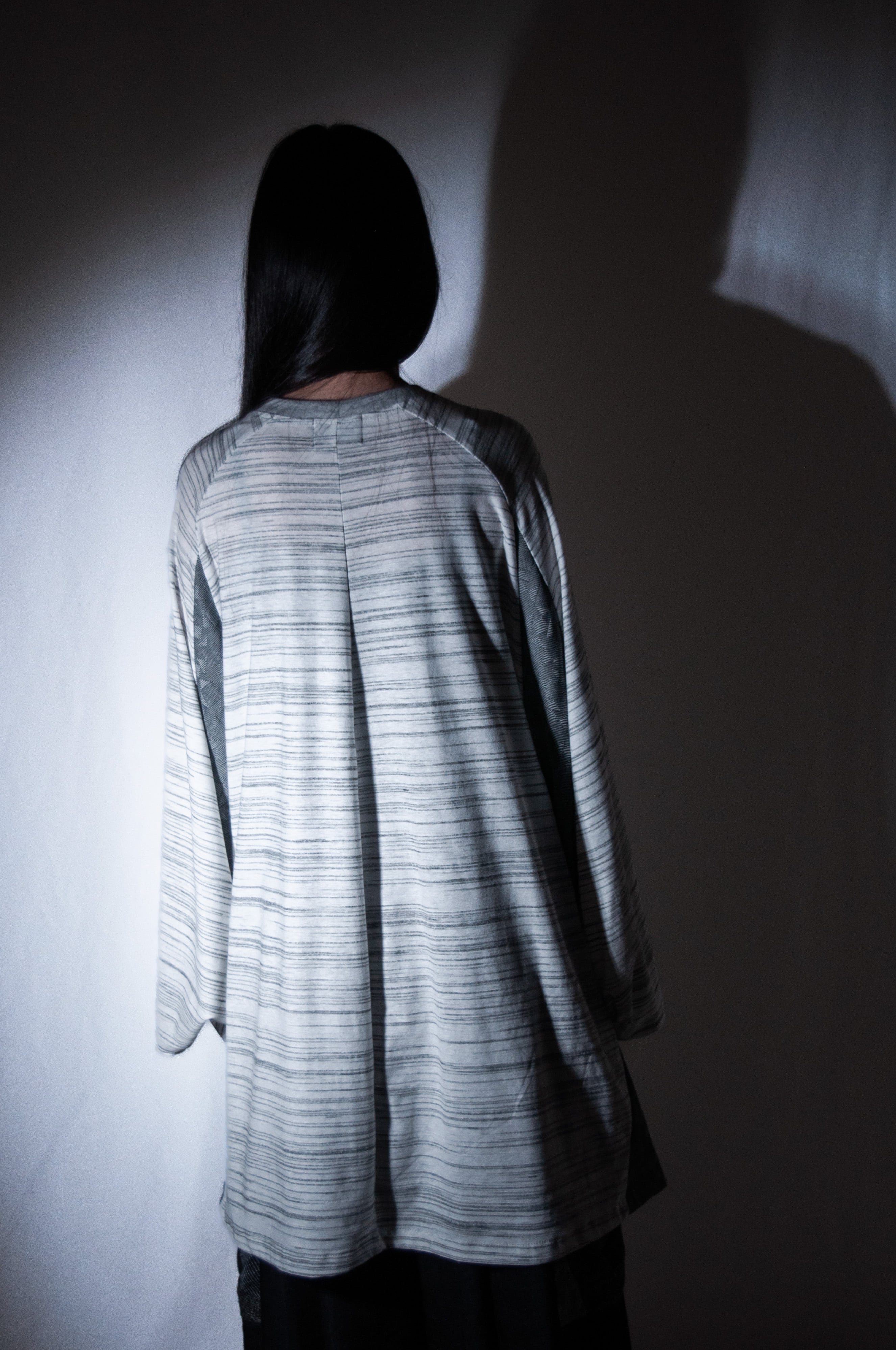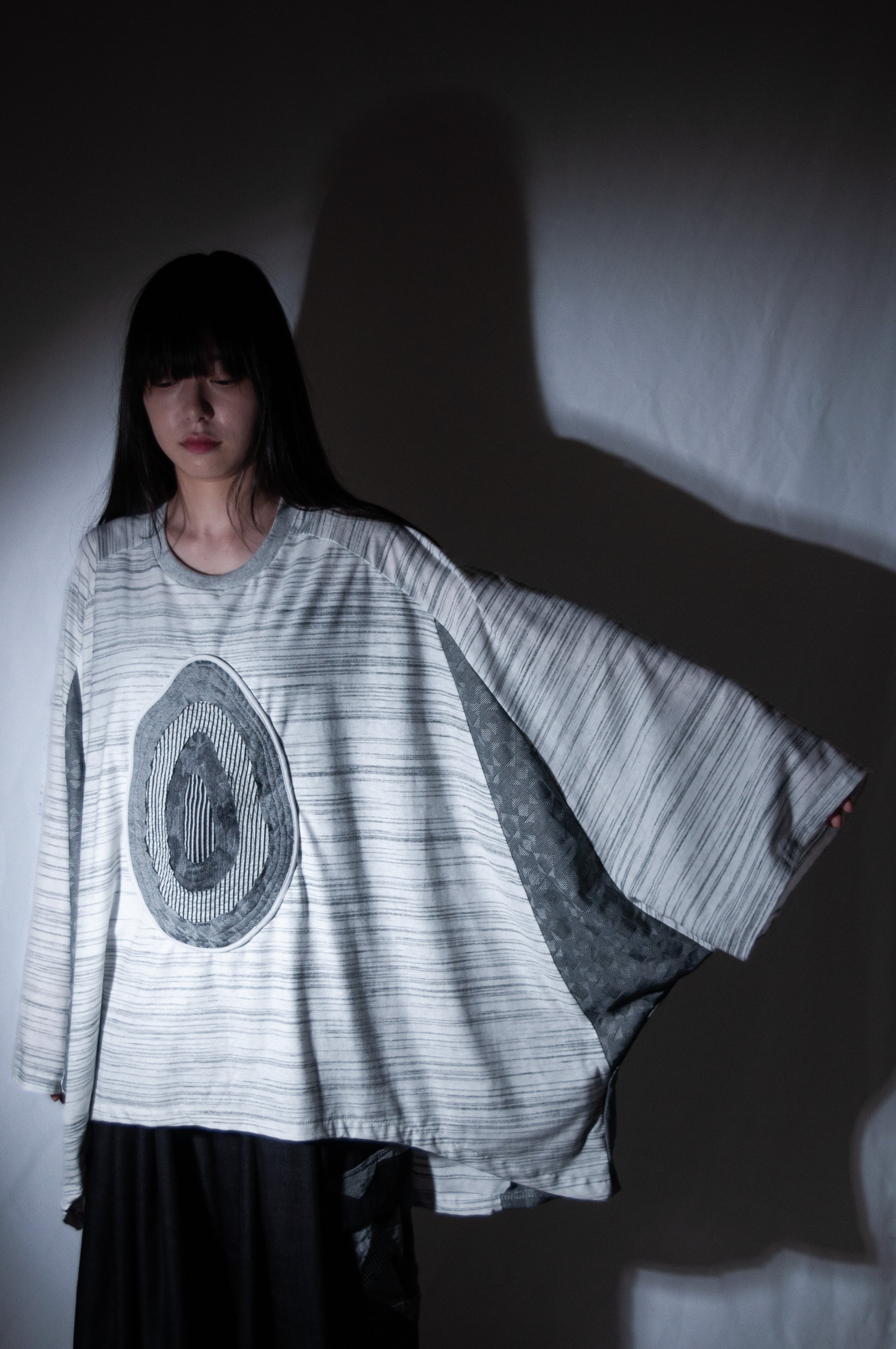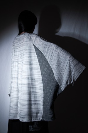 和服を思わせる直線の切り替えと袖の構成に、袖下のゆるやかな曲線が交差し