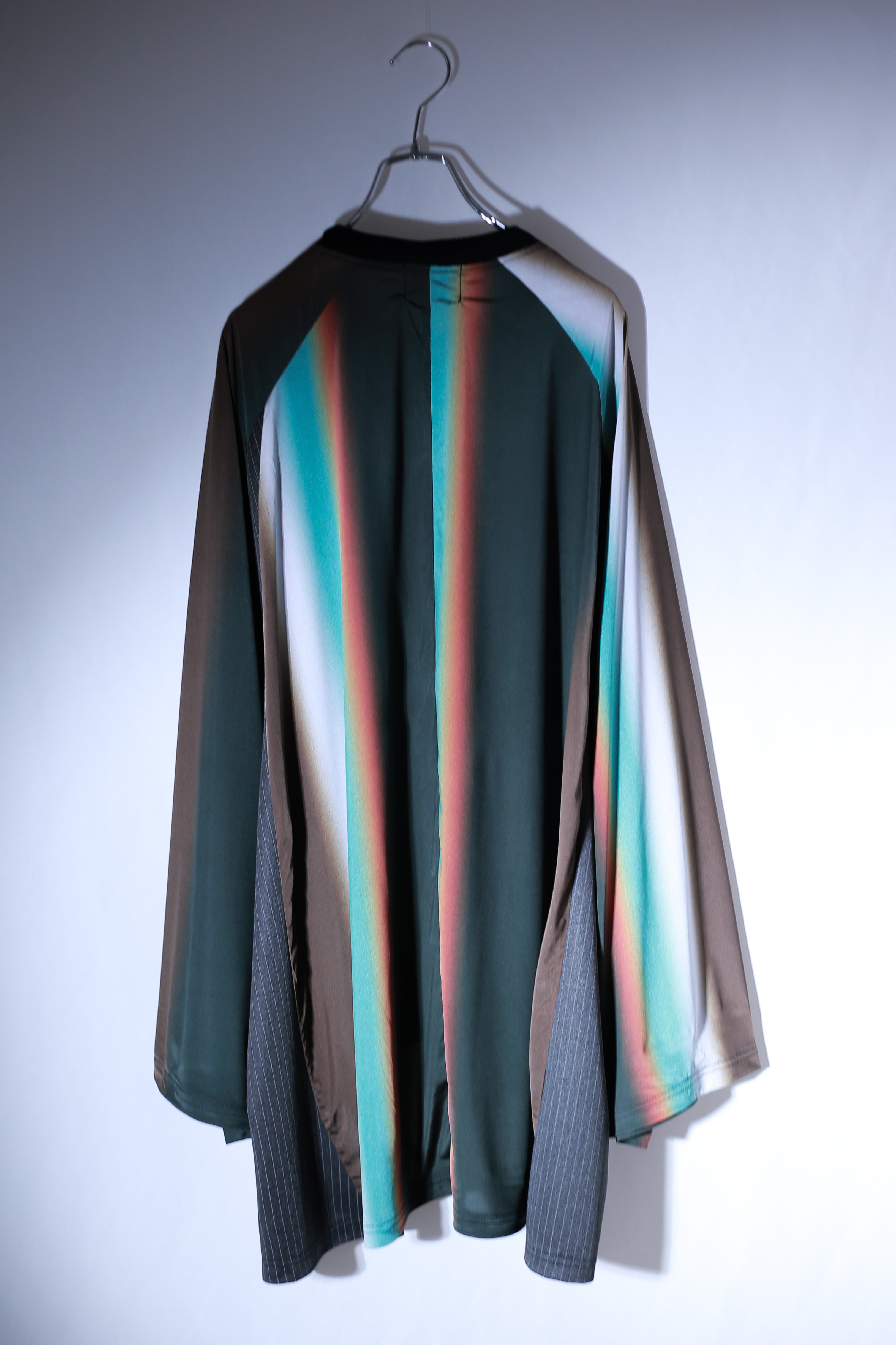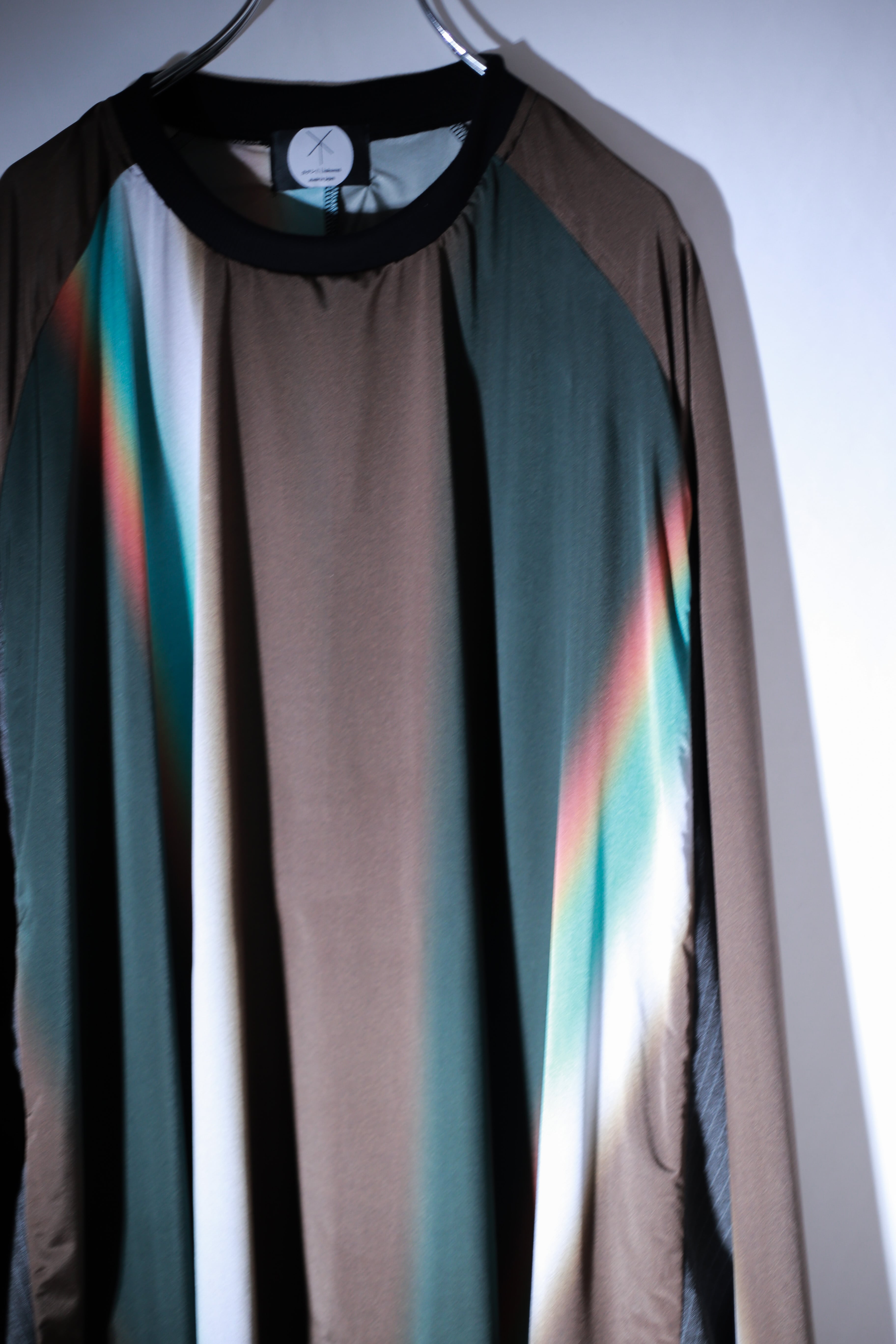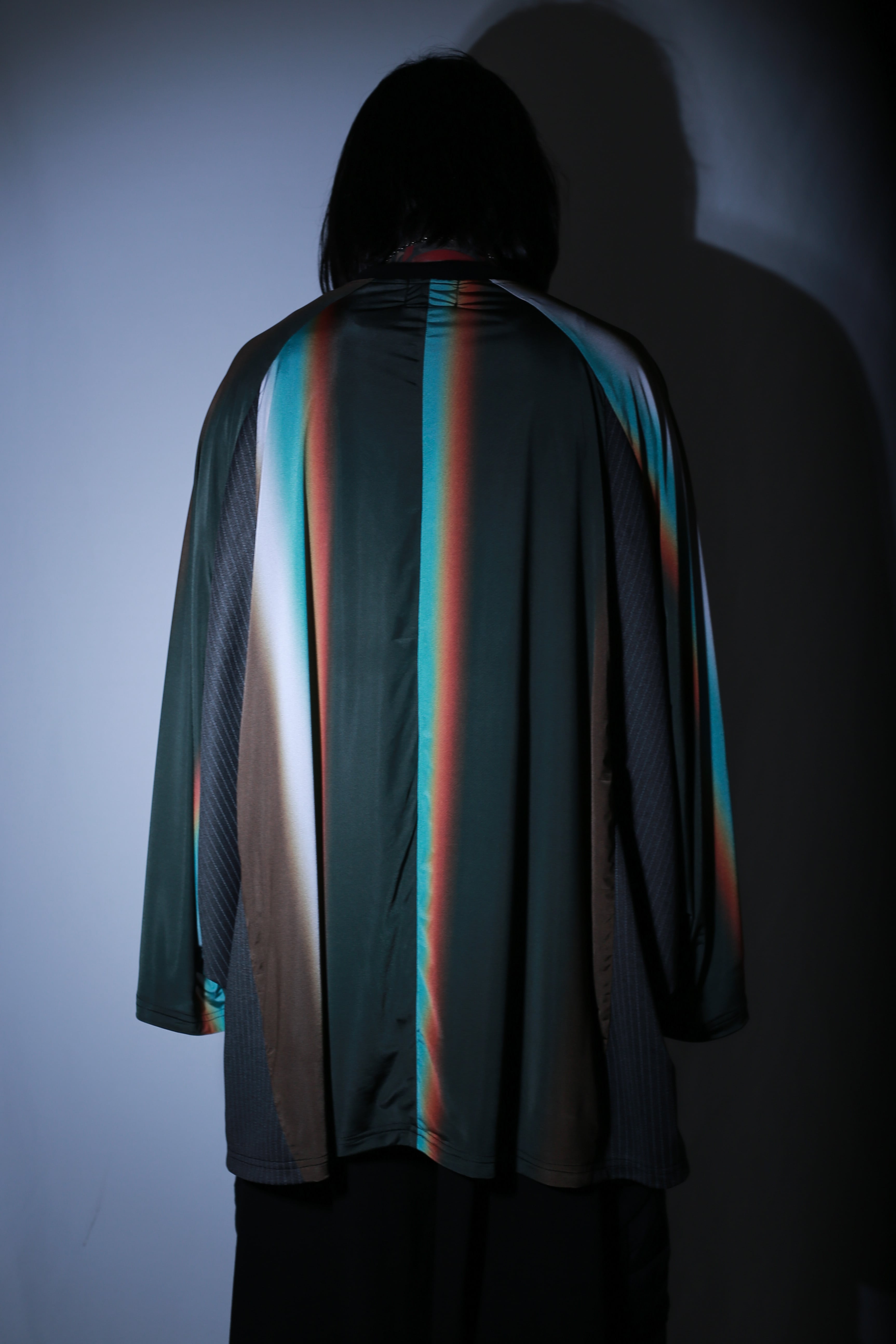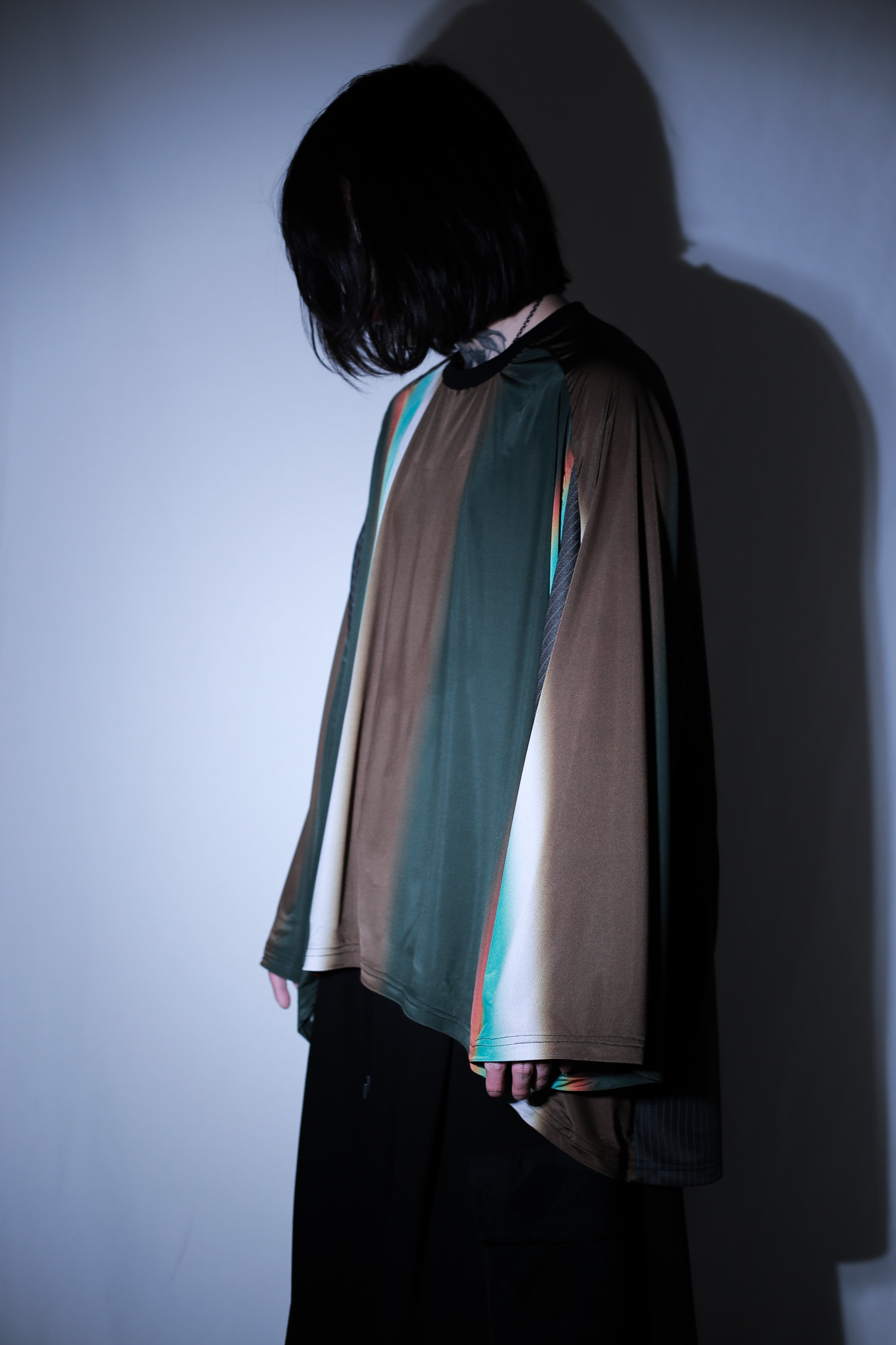 和服を思わせる直線の切り替えと袖の構成に、袖下のゆるやかな曲線が交差し