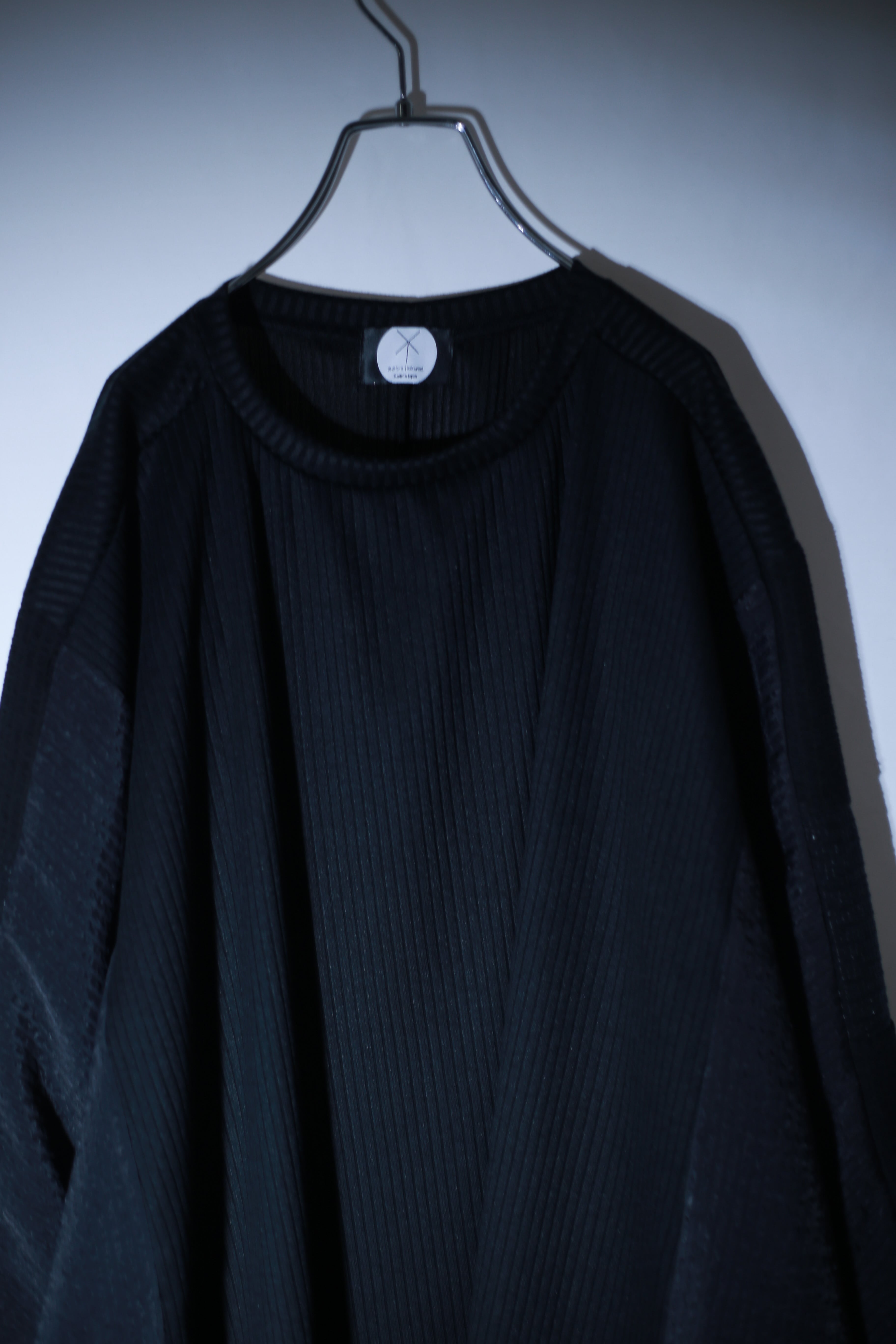 直線的なパターンが、身体の輪郭を曖昧にしながら静かなボリューム感を描きます。