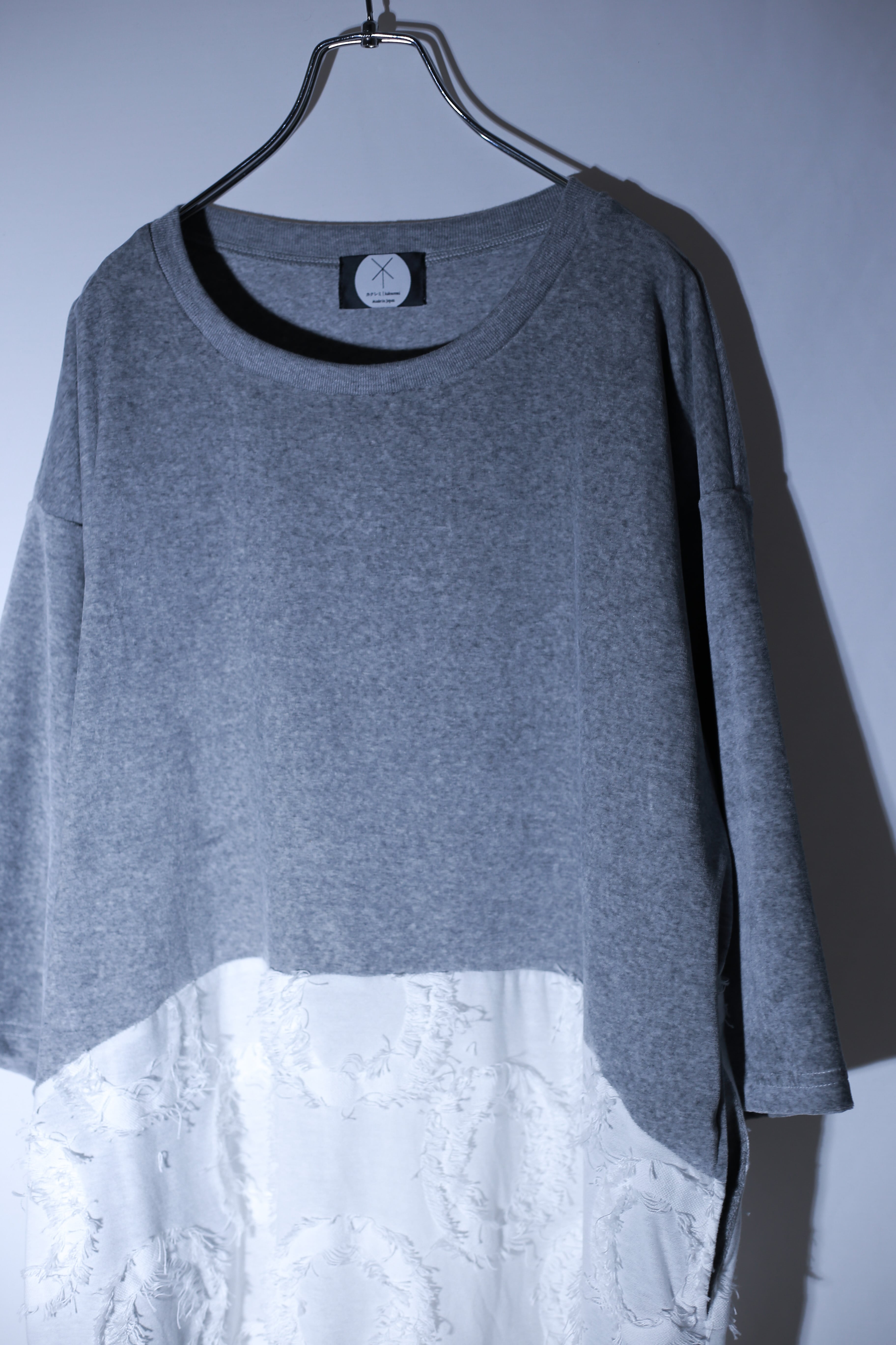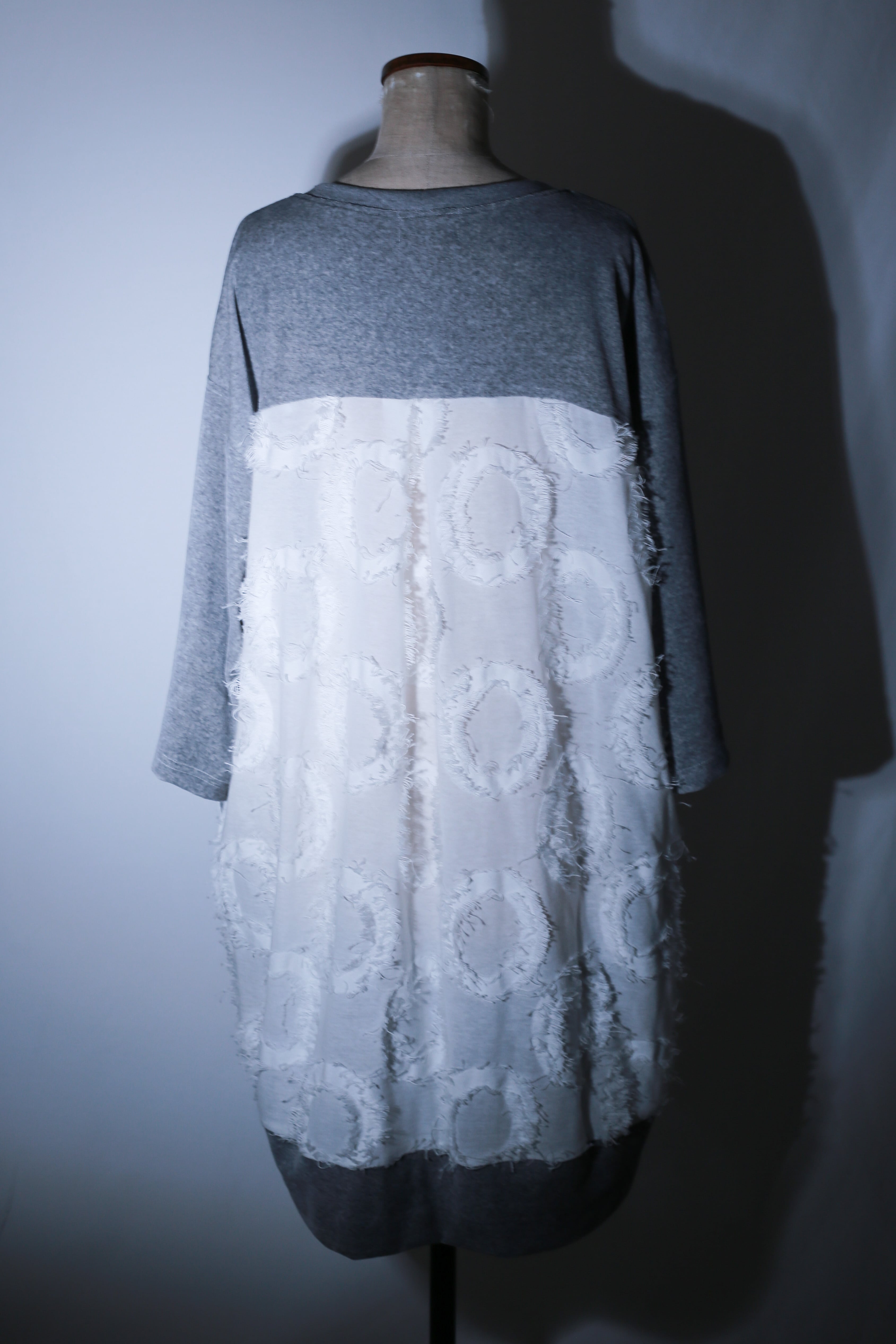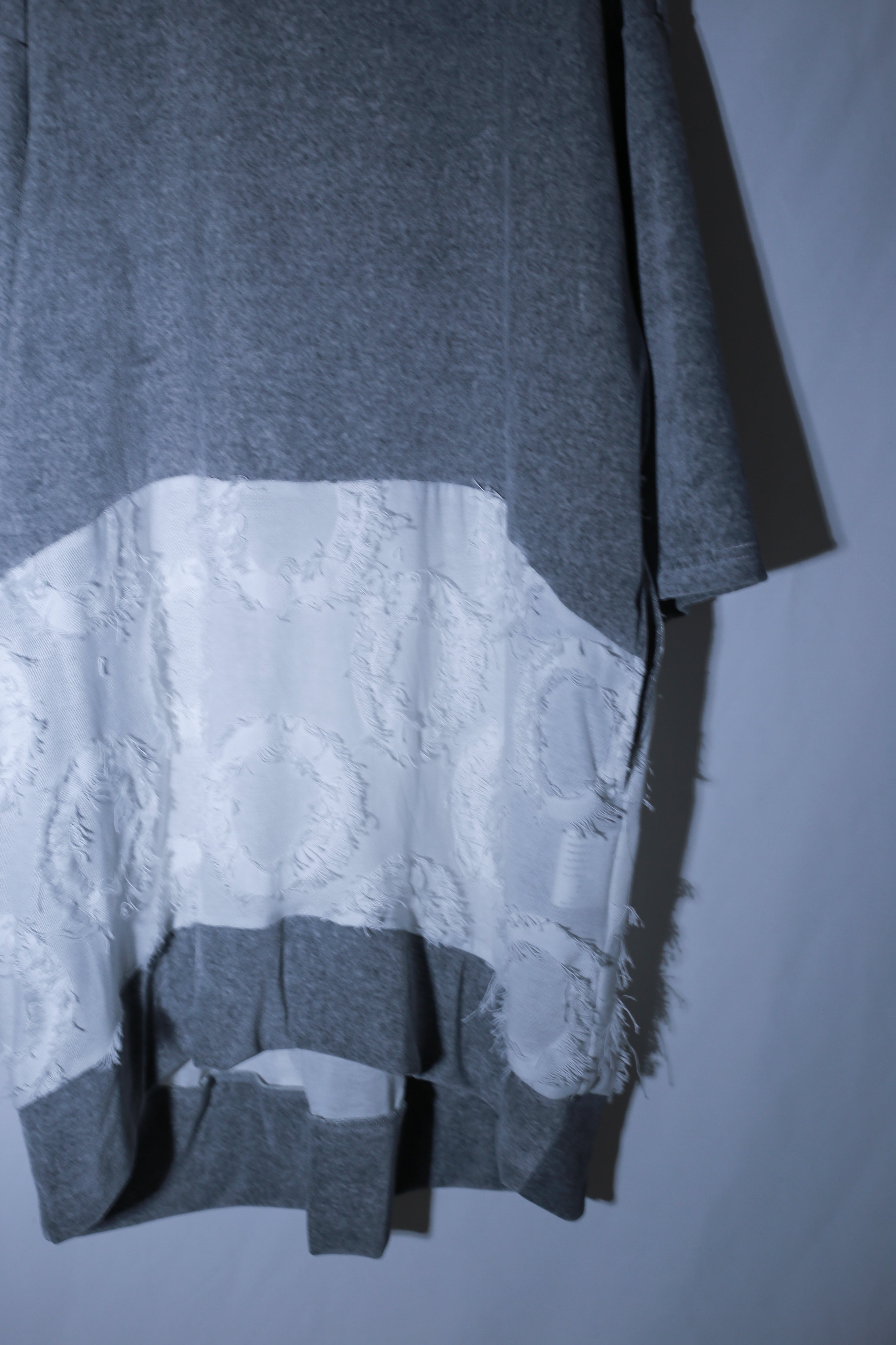 透け感のあるカットジャガードの白の生地とグレーの軽やかなコットンニットは、それぞれのジャガード調の凹凸が陰影を生み出します。