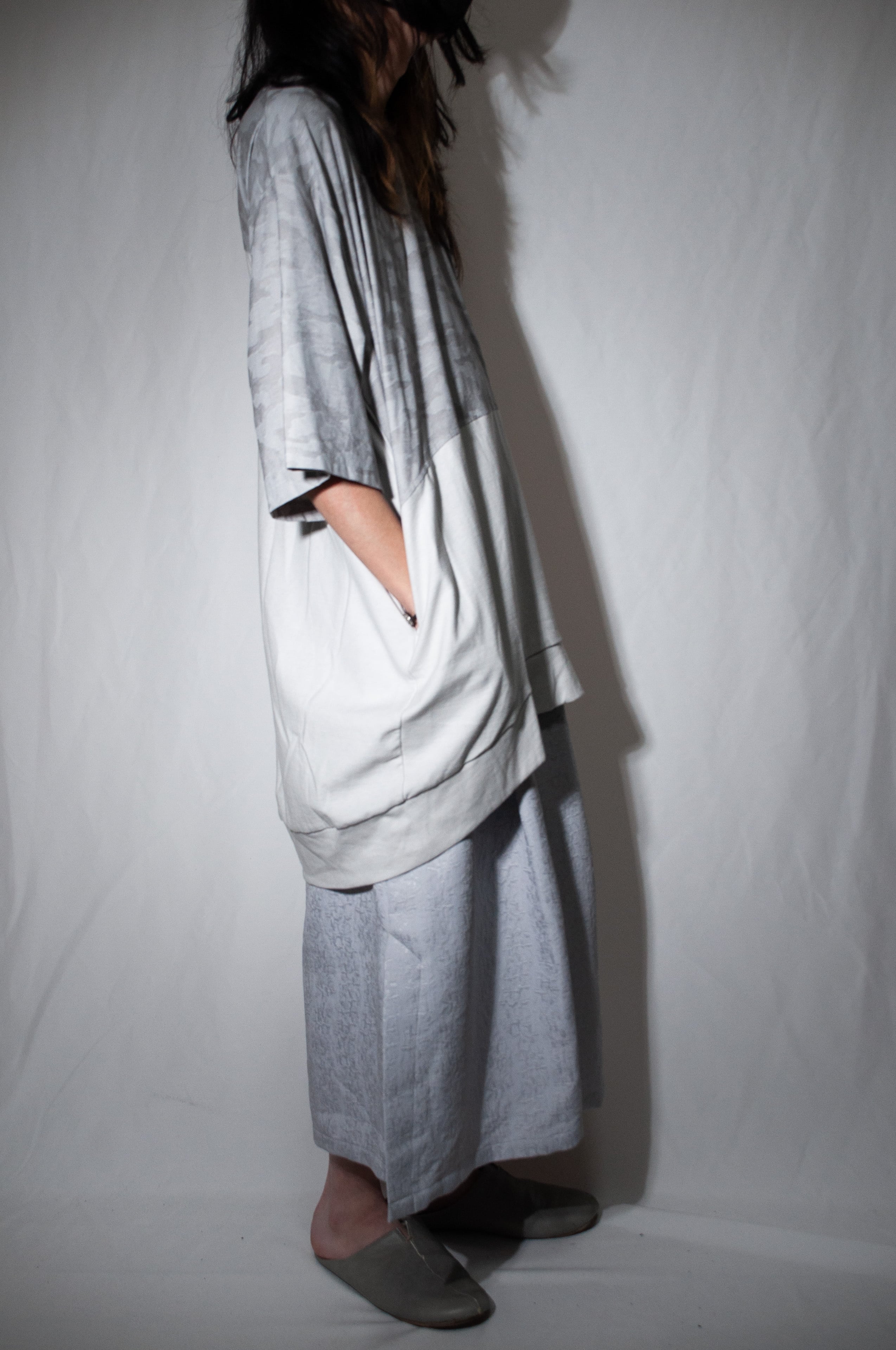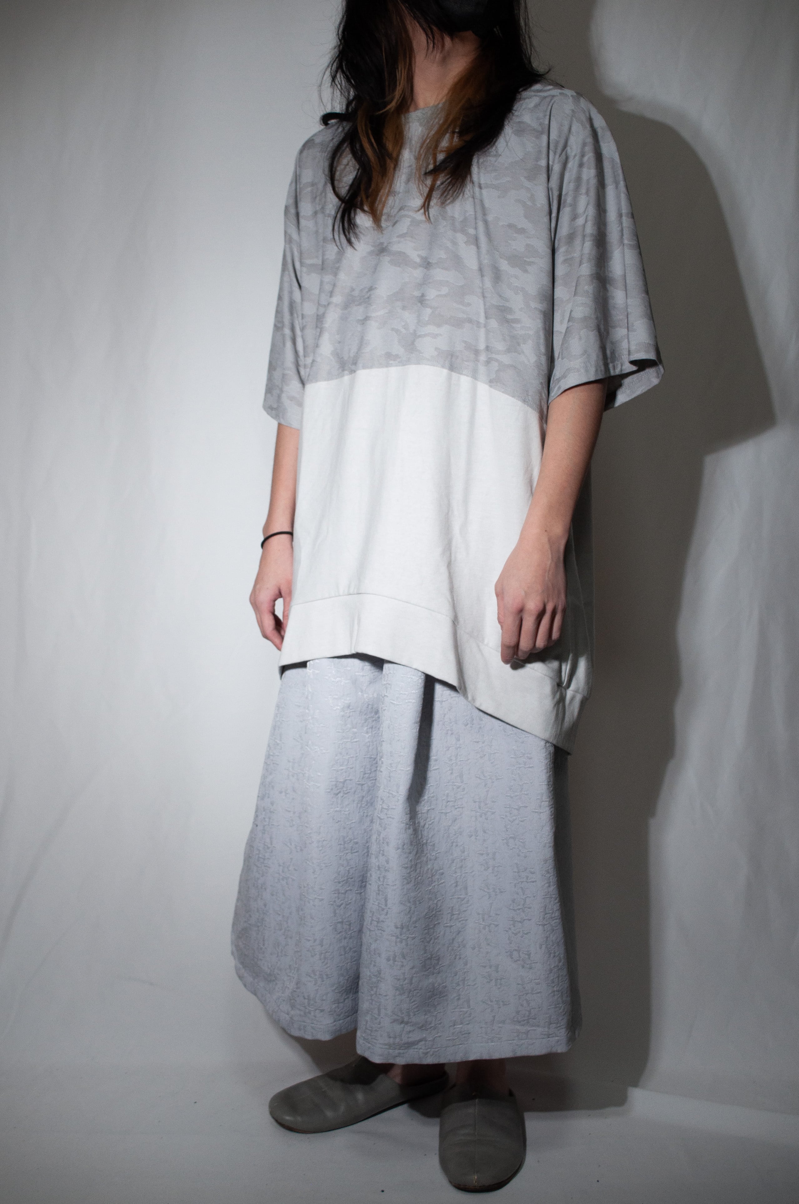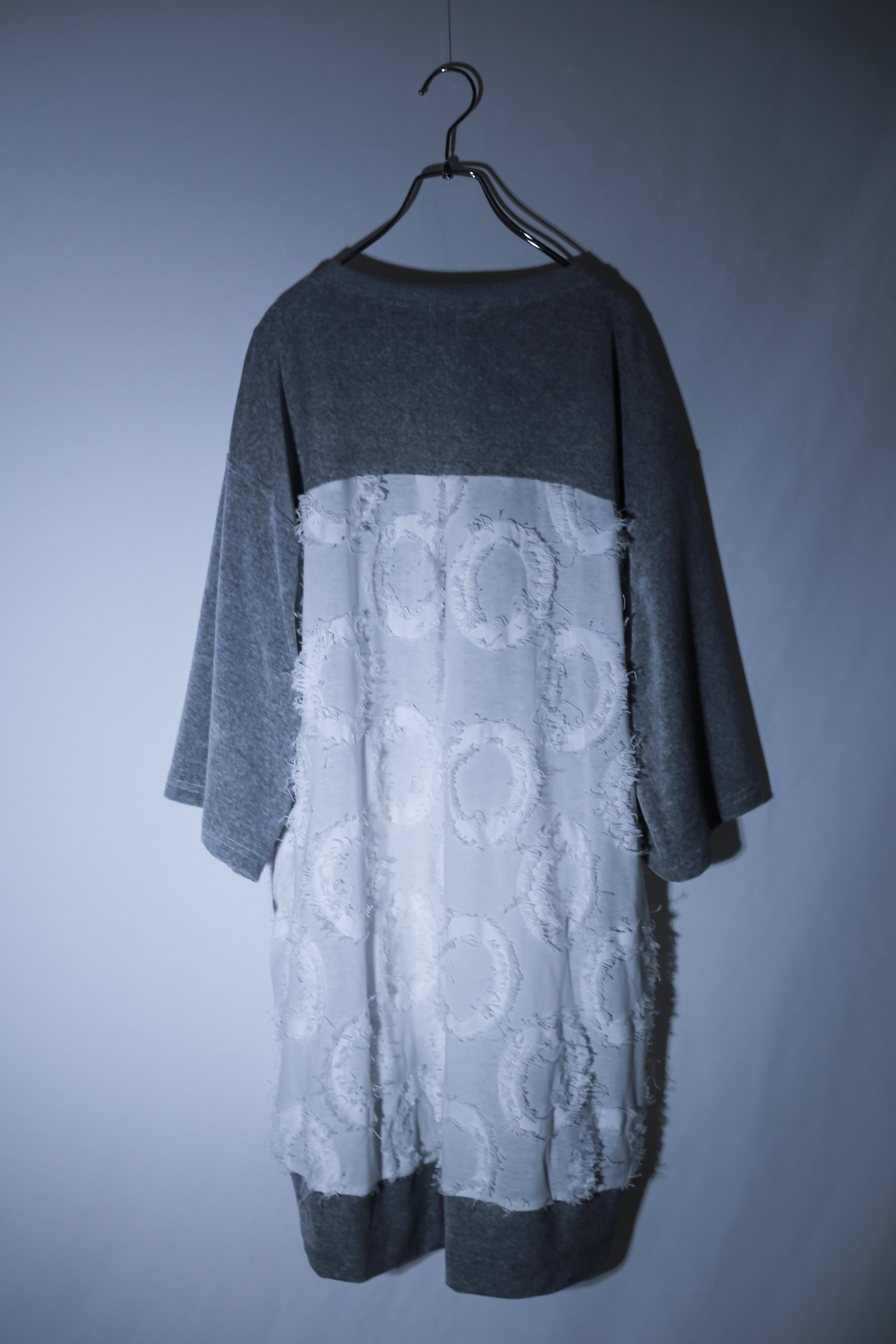透け感のあるカットジャガードの白の生地とグレーの軽やかなコットンニットは、それぞれのジャガード調の凹凸が陰影を生み出します。